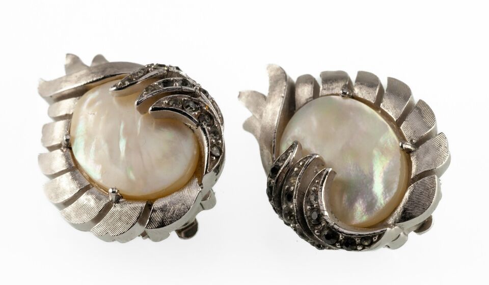 Trifari Vtg Costume Jewelry Set Silvertone Pearl Belly Rooster Brooch Earrings added to cart.