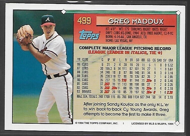 1994 Topps Greg Maddux Baseball Card #499 Atlanta Braves