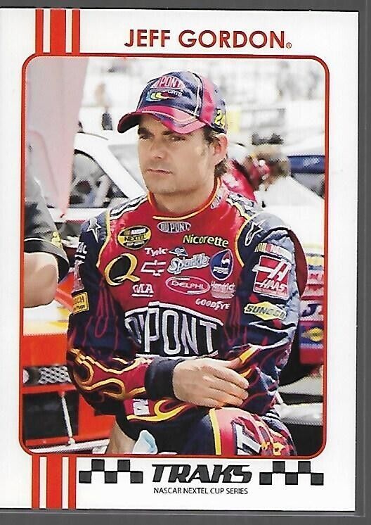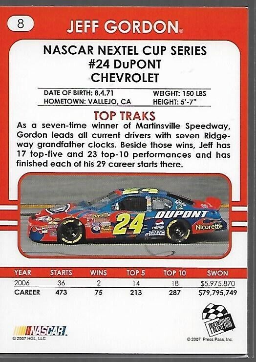Ships PWE. This 2007 Press Pass Traks trading card features Jeff Gordon, driver of the Dupont #8 car in the NASCAR racing series. The card is made of high-quality card stock with a standard size and showcases an original design by Press Pass. As a fan of auto racing or a collector of sports trading cards, this item is a must-have for your collection. The card is part of the 2007 Press Pass Traks series and is an original, licensed product. It is not autographed and is not a vintage or reprint item. Whether you are adding to your existing collection or starting a new one, this Jeff Gordon trading card is a great choice.