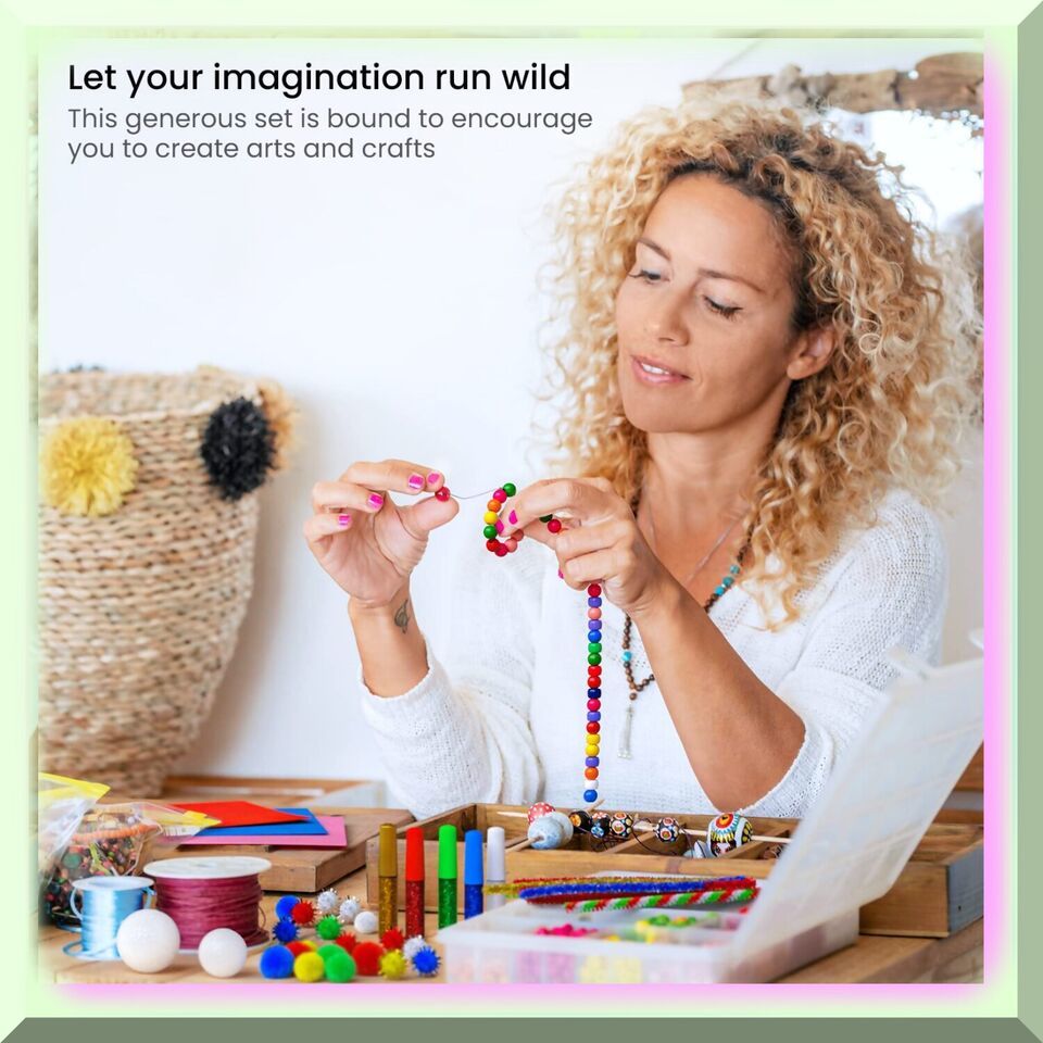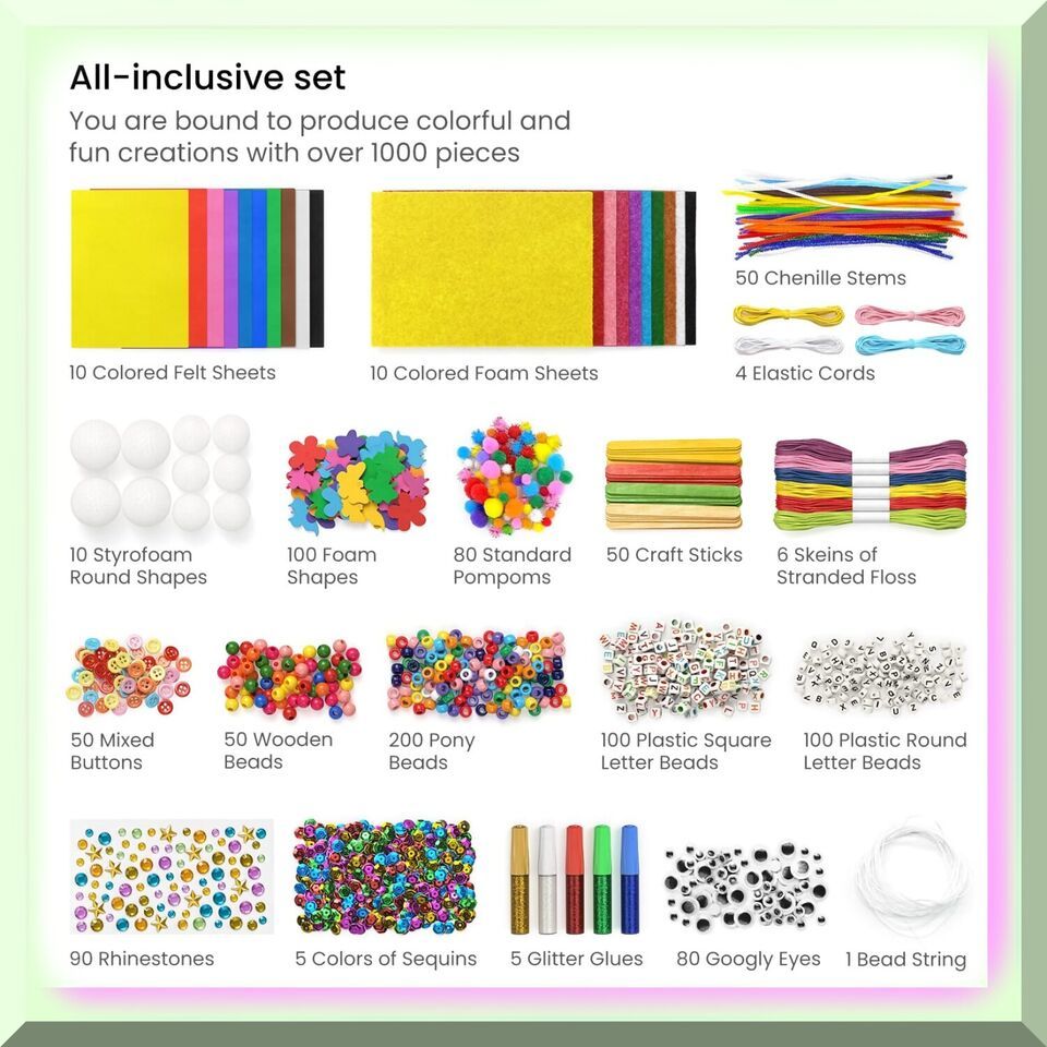 Unleash your creativity with our ultimate set for creative minds! With over 1,000 pieces including fuzzy sticks, poms, gemstones, sequins, and more, the possibilities are endless. Turn sticks into your favorite characters, add wiggly eyes to make funny creatures, or color a picture and decorate it with gems and glitter. This set is perfect for bringing people together and allows for extreme creativity. Plus, the storage container with handles makes it easy to take on the go. Use the beads to create signage or make fun hairstyles and trees with the included pom poms. The ideas for crafts and art projects are endless. This set makes a wonderful gift for birthdays and holidays. Our guarantee to you is that we care about our customers and are passionate about creating products that inspire. If you have any issues with our products, please reach out and we'll make it right.