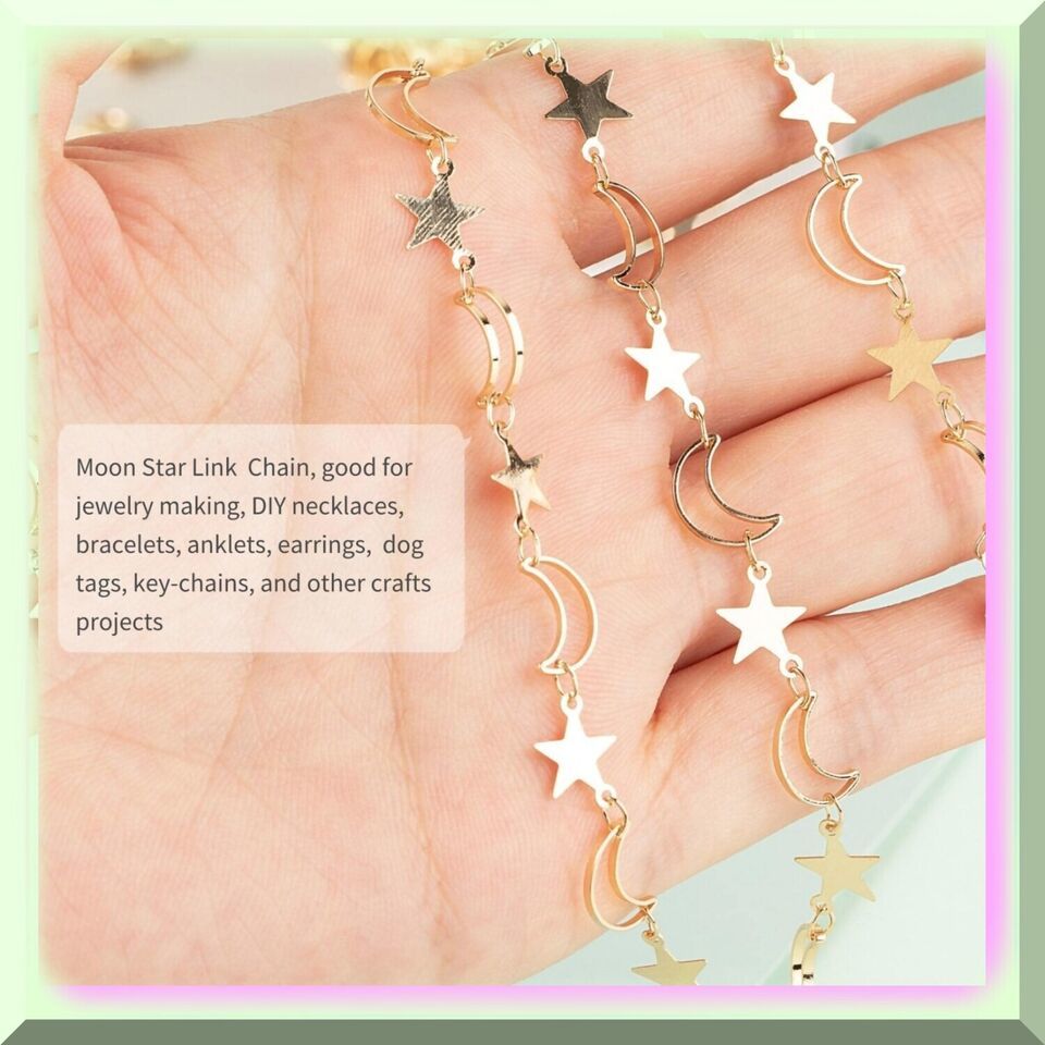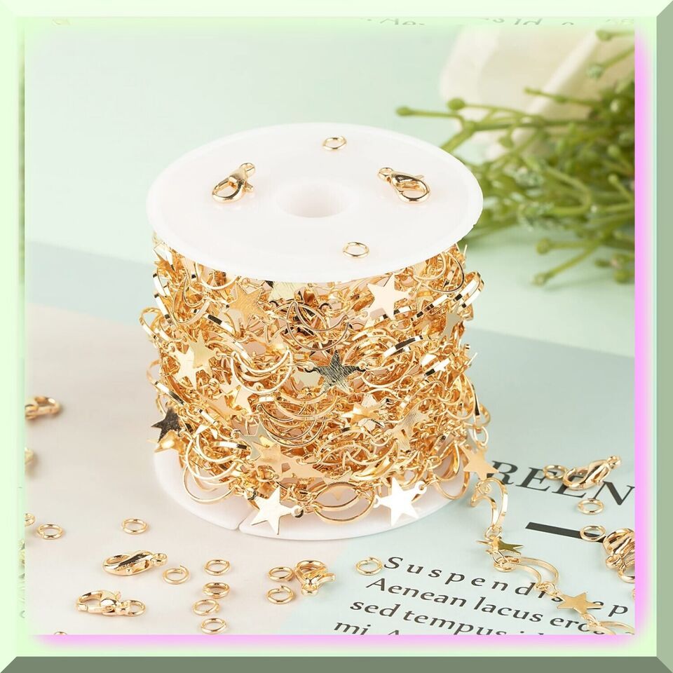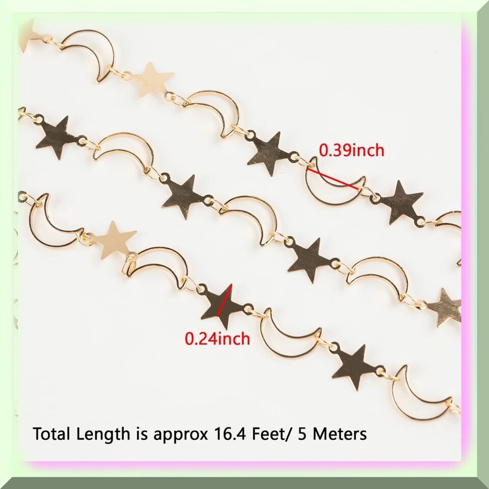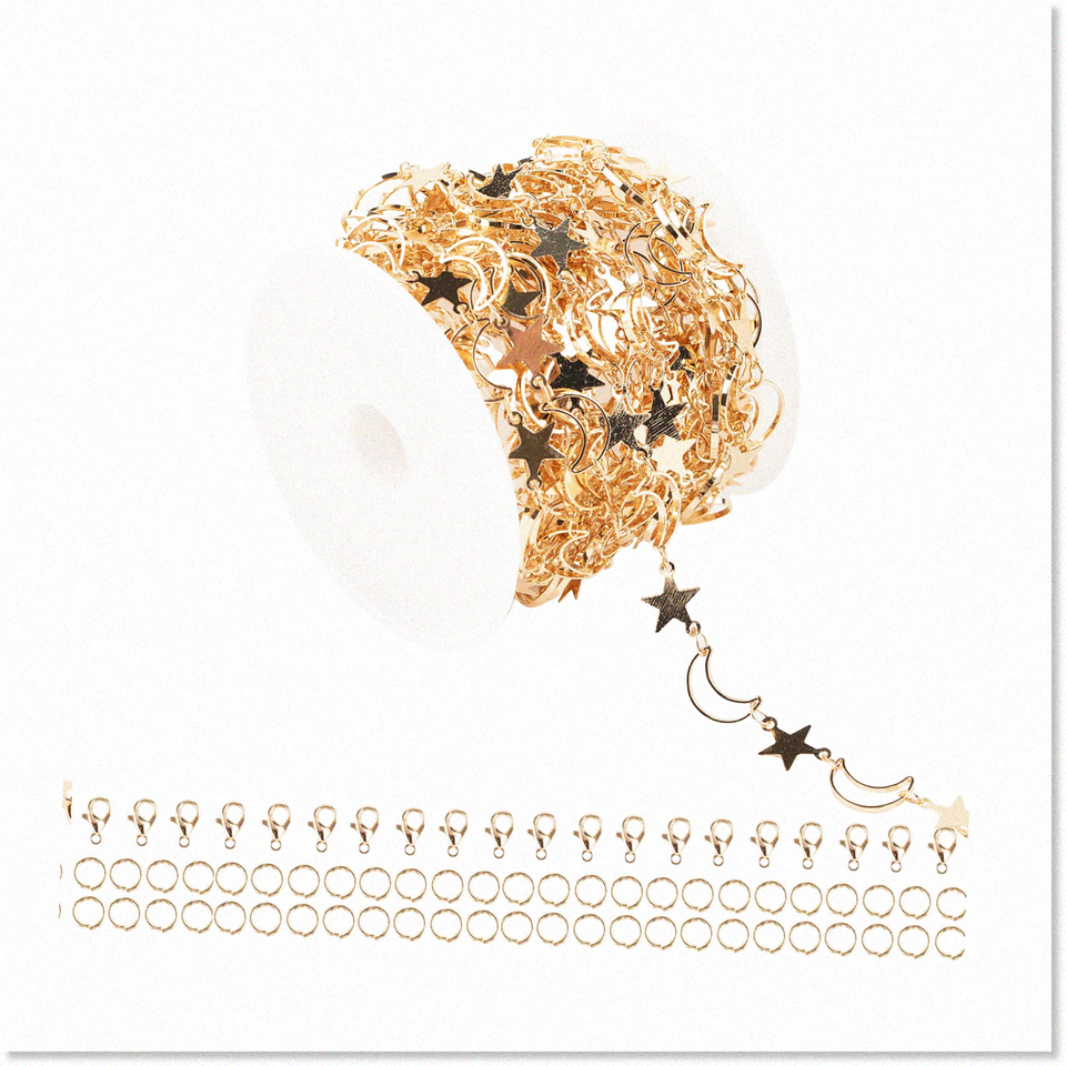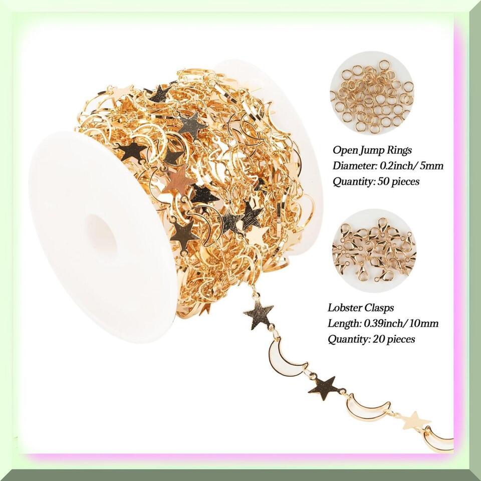 Introducing our Gold Br Chain Bulk for Jewelry Making! This product is perfect for those who love to create their own unique jewelry pieces. The br chain is 5 meters long and comes with 20 br lobster clasps and 50 br jump rings. The moon link length is about 10 mm/ 0.39 inch and the star link length is about 6 mm/ 0.24 inch.