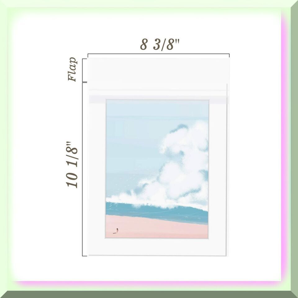 Experience the convenience of our innovative re-sealable adhesive strip, strategically placed below the opening of the bag instead of on the flap. This ingenious design allows you to effortlessly fold it over and securely seal the bag's opening. Our versatile strip is compatible with various items, including mat frame backing+ print, mat frame foam board print, double mat frame backing+ print, and even 8ply mat picture frame backing+ print.---FEATURES:---Astonishingly fresh, behold the brand new pack of 100, meticulously crafted with utmost precision. These clear bags, measuring 8 3/8 x 10 1/8 inches, are the epitome of perfection. Designed specifically for 5x7 photo mats, they effortlessly accommodate an 8x10 double mat with backing. Prepare to be captivated by their clarity and brilliance, as they elegantly showcase your cherished memories. With this remarkable product, your photos will be protected from dust, fingerprints, and any potential damage, ensuring their longevity. Immerse yourself in the world of creativity and preservation with these exceptional bags, a true testament to innovation and quality.