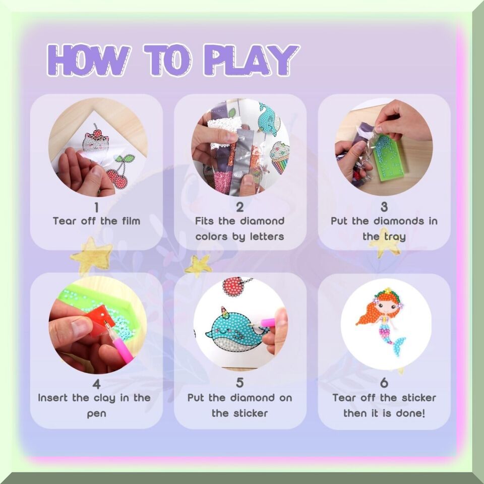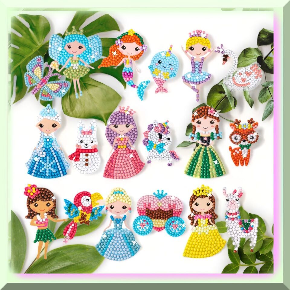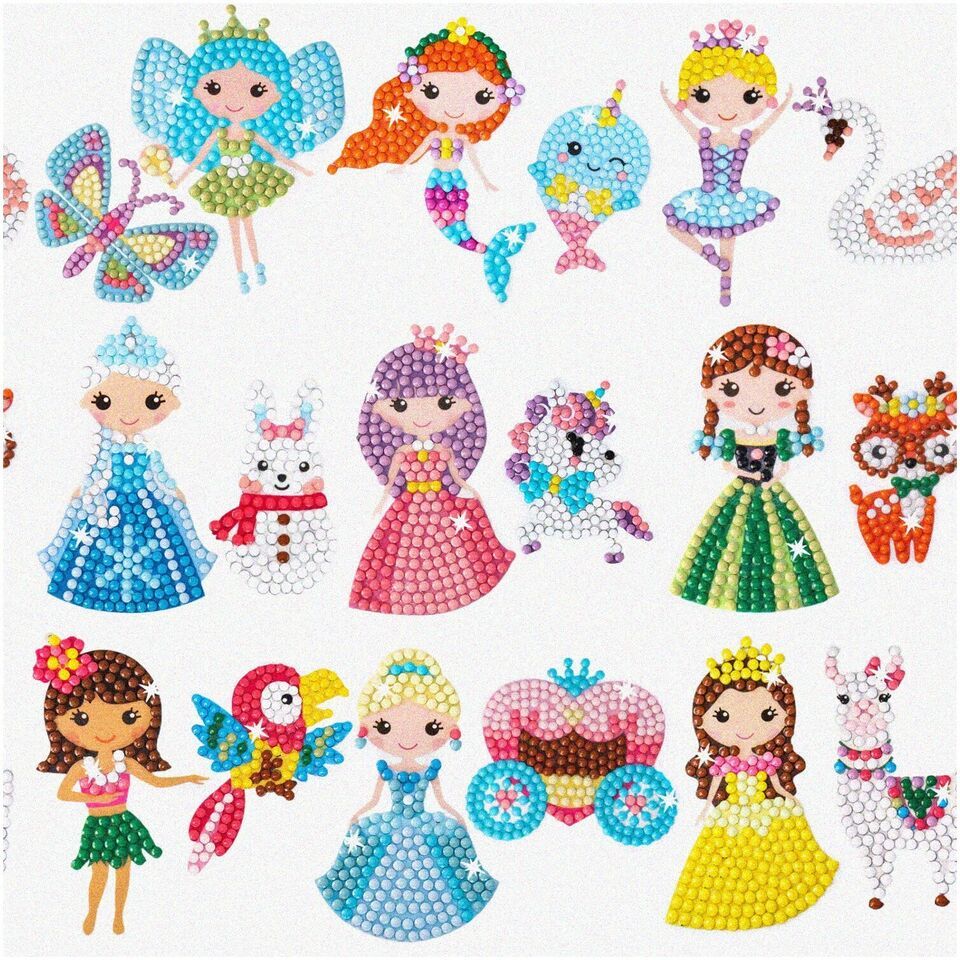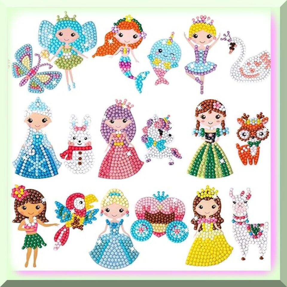 Experience the Magic of Diamond Art: Unleash your creativity with our mesmerizing diamond stickers, accompanied by two exquisite diamond painting pens and a set of diamond art tools. Dive into a world of enchantment with our delightful collection of cute characters, including unicorns, cats, mermaids, rainbows, bunnies, and flowers. Rest easy knowing that our environmentally friendly resin diamond art stickers are safe for your little ones, boasting smooth edges, vibrant colors that never fade, and a child-friendly design. Creating stunning artwork has never been easier - simply peel off the transparent film, dip with clay, and paint by number or letters. Seal the deal with our extra dot sticker, ensuring your diamonds stay secure. Make any occasion extra special with our kids diamond painting kit, the perfect gift for Thanksgiving Day and birthday parties. Let your imagination sparkle and shine!---FEATURES:---A) Create Stunning Diamond Art: Unleash your inner artist with our exquisite diamond art kit. Immerse yourself in a world of shimmering brilliance as you bring to life 20 captivating designs. Each kit includes 20 special design diamond stickers, meticulously crafted to dazzle and delight. With 2 diamond painting pens and 2 sets of diamond art tools, you'll have everything you need to create a masterpiece that will leave everyone in awe.