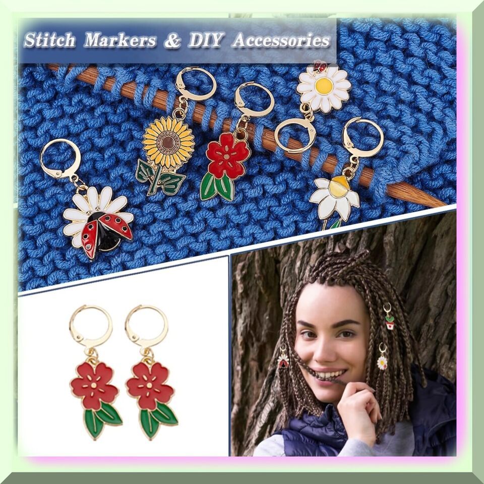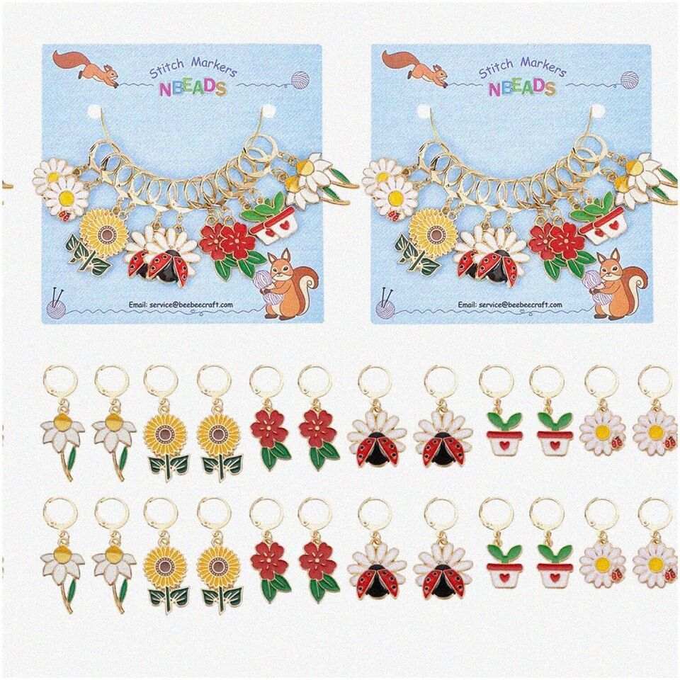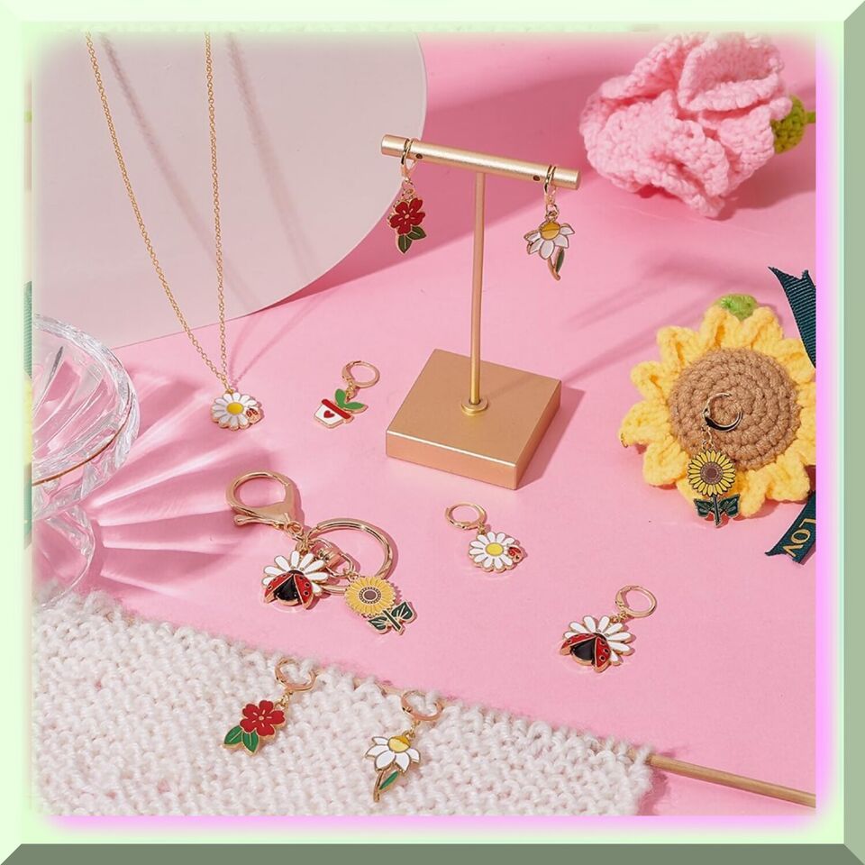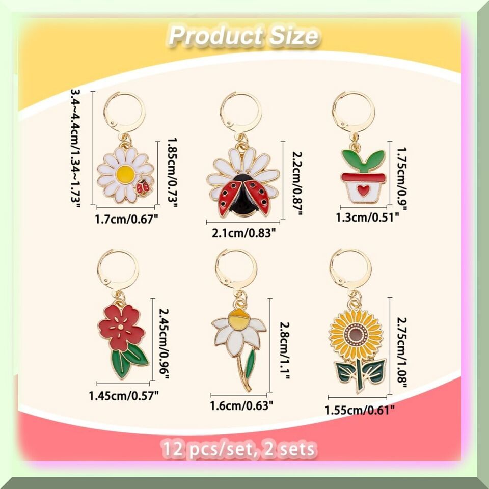 Welcome to our accessory haven! We're dedicated to providing you with the most diverse and affordable accessories out there. If you're someone who lives and breathes creativity, we're your go-to partner. Our latest offering is made of alloy and enamel, with a gorgeous golden hue. The set includes 2 pieces of each: Flower (18.5x17x3mm), Potting with Heart Leaf (17.5x13x1.5mm), Flower with Ladybird (22x21x3.5mm), Sunflower (27.5x15.5x1mm), Flower (24.5x14.5x1.5mm), and Flower (28x16x2mm). Please note that due to lighting and monitor settings, there may be slight color differences. Don't hesitate to contact us if you have any issues with the quality. And remember to pay attention to the sizes! ==== FEATURES: ===== Diverse Plant Styles - Unleash your creativity with our exquisite collection of plant stitch marker charms. Each package is a treasure trove of botanical wonders, boasting a delightful assortment of 6 distinct styles. Immerse yourself in the enchanting world of flora as you explore the mesmerizing beauty of 4 captivating flower patterns. Let the vibrant petals and intricate designs inspire your knitting journey. And that's not all! Our charming package also features a whimsical ladybug pattern, adding a touch of whimsy to your creations. And for those who adore the allure of potted plants, we have included a delightful pot plant pattern that will transport you to a serene garden oasis. With these diverse plant styles, your knitting projects will bloom with elegance and grace.