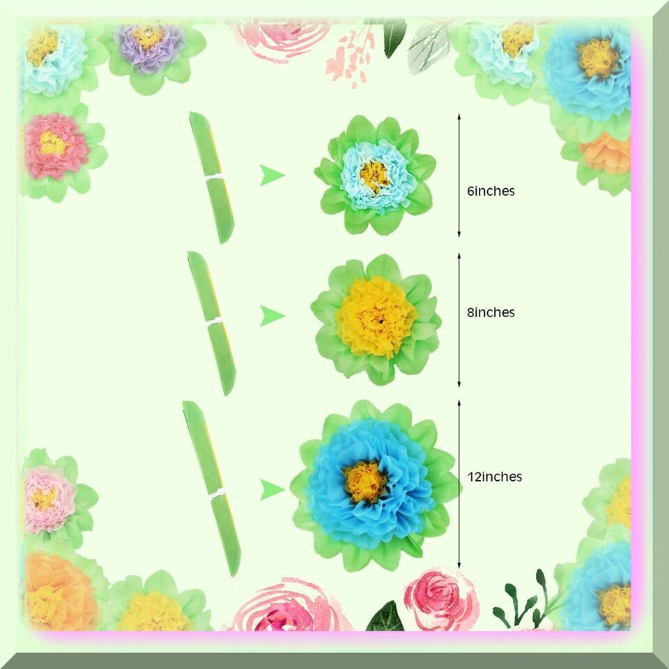 Pristine Package: Unveiling an exquisite assortment of 18 vibrant fiesta paper flowers, this package is a kaleidoscope of colors. Immerse yourself in the enchanting hues of purple, blue, light blue, pink, rose red, orange, and yellow. Each color is meticulously crafted into three different sizes, measuring 6 inches, 8 inches, and 12 inches.
