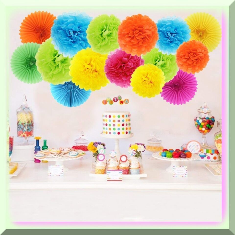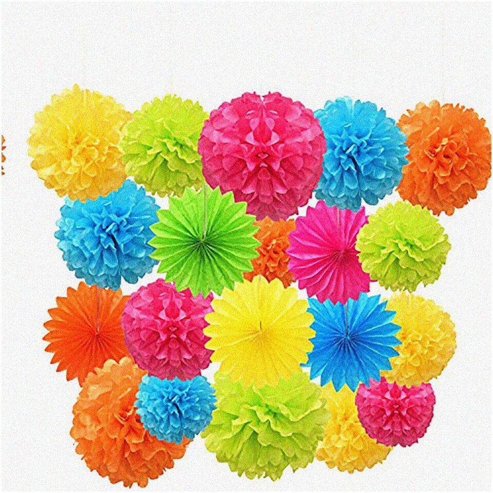 Colorful Celebration Set: Paper Pom Poms, Tissue Flowers, Hanging Paper Fans - P