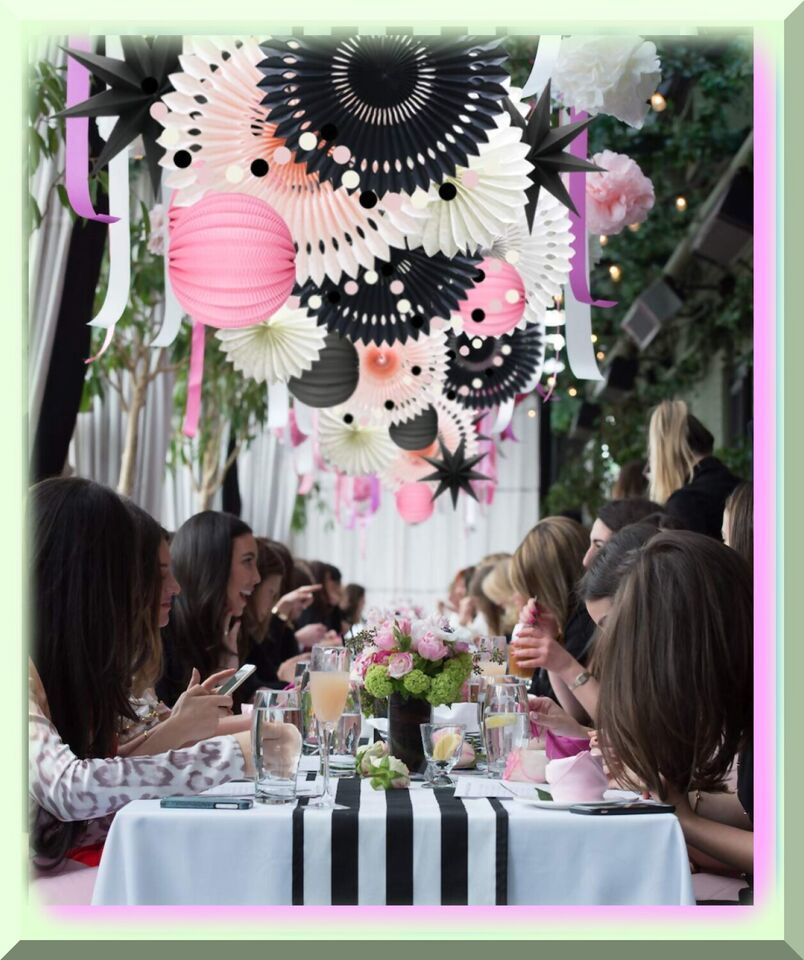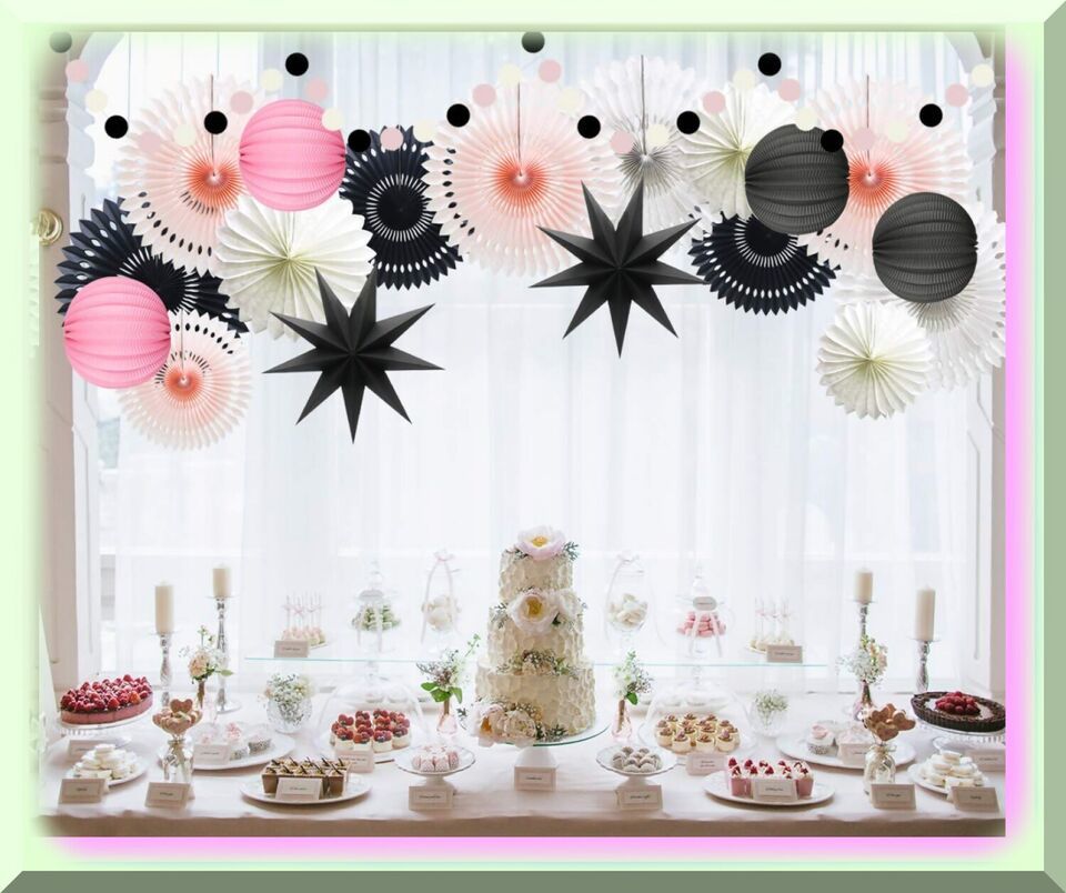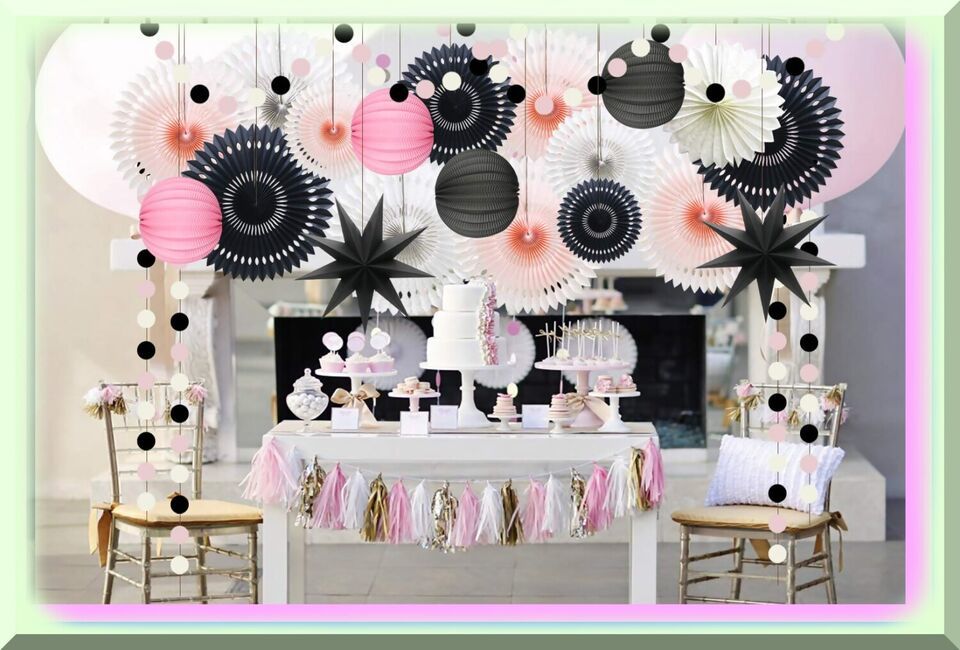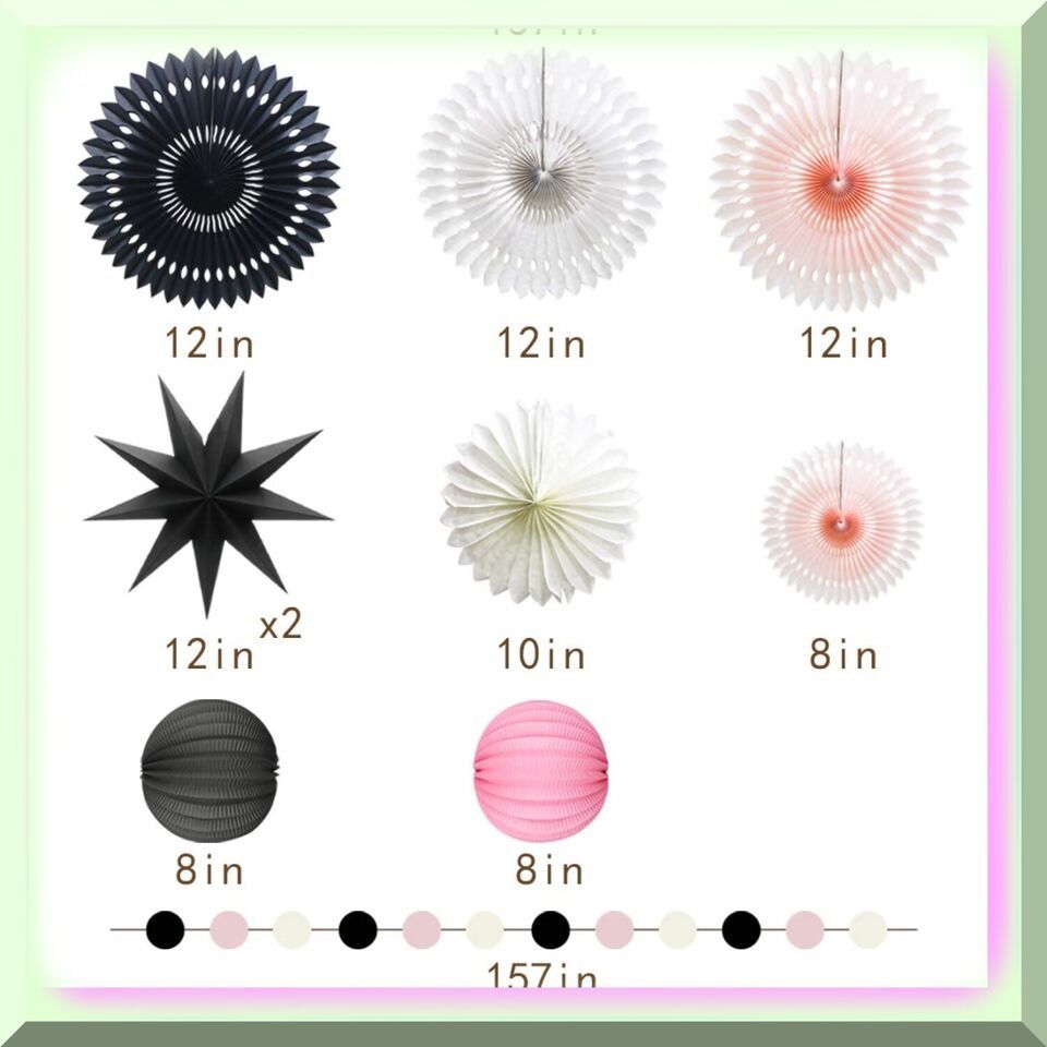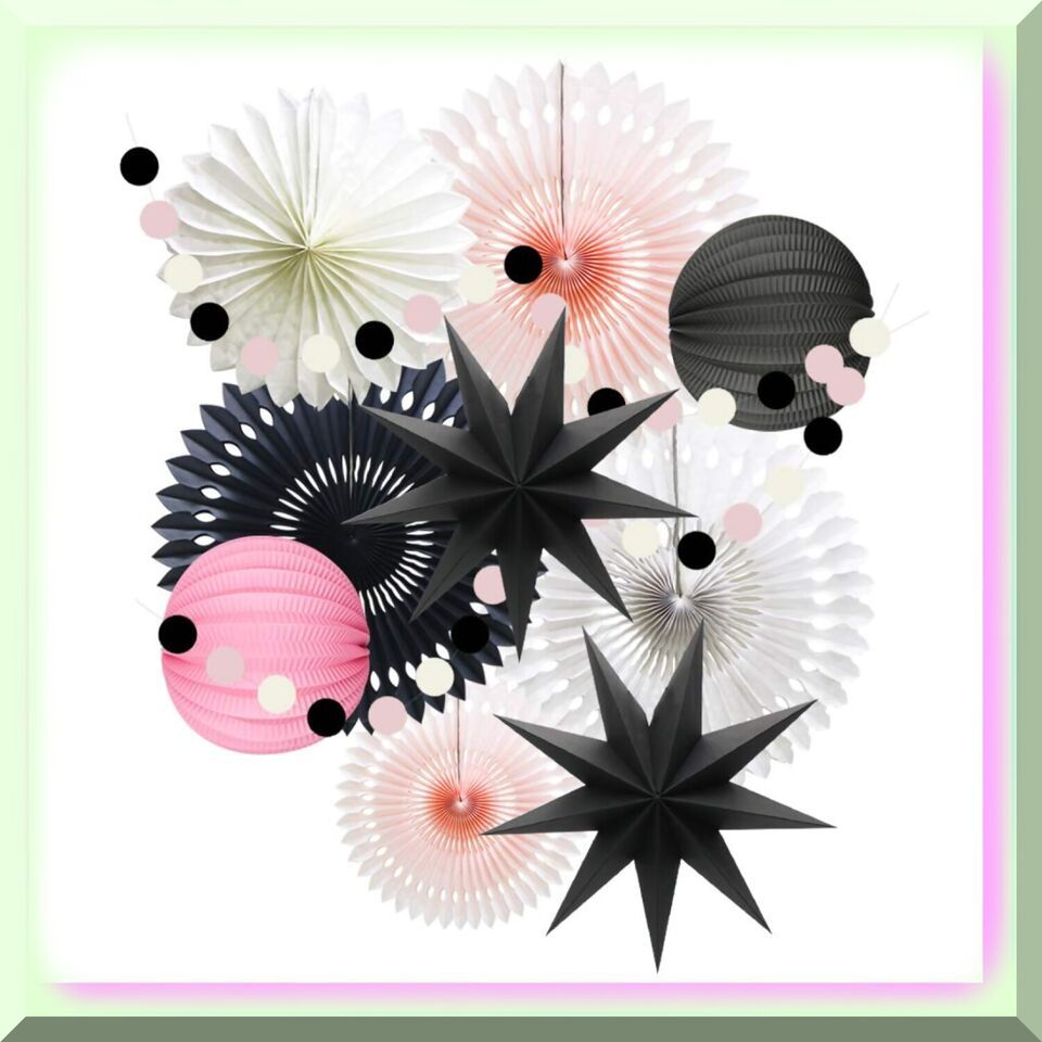 - 4 pieces of pink, black, and white hanging hollow-out paper fans in 12in3 and 8in1 sizes.