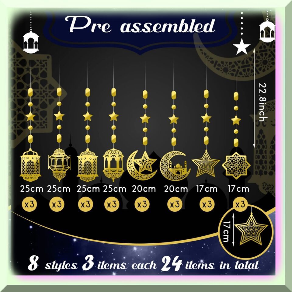 A) Assortment: Our Eid Decoration Kit includes a diverse range of 24 pieces, offering a variety of 8 different styles and shapes to choose from.