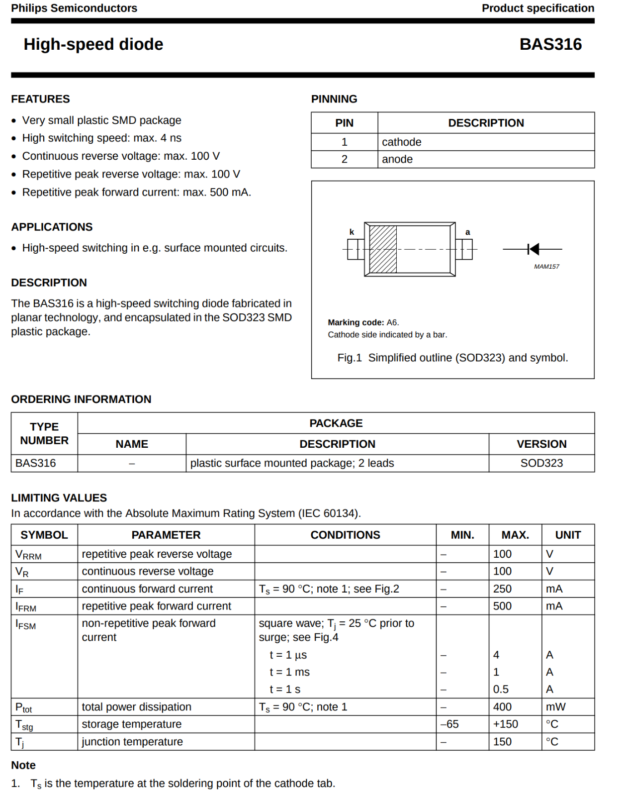 BAS316 Philips High Speed Switching Diode 100V 250mA SOD323