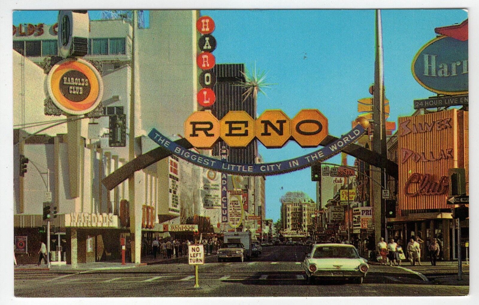 Postcard NV Reno Harolds Club Silver Dollar Vintage Street Sign Old Cars