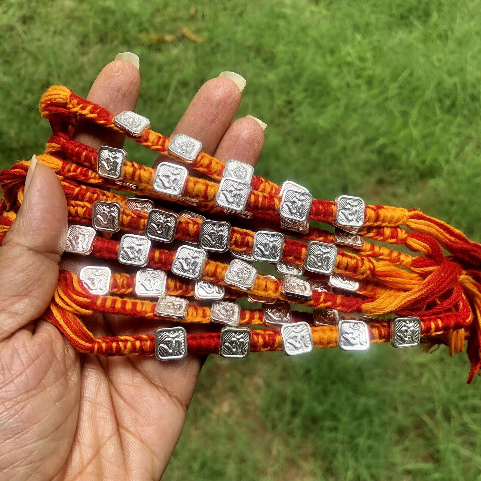 rakhi de plata, kalaya rakhi, kalawa rakhi, pulsera rakhi, encantos de plata, encantos religiosos, pulsera religiosa, encantos hindúes, rakhi hecho a mano