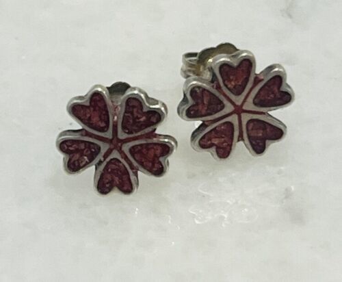 Sterling Silver 925 Coreal Inlay Lucky Four Leaf Clover Stud Earrings