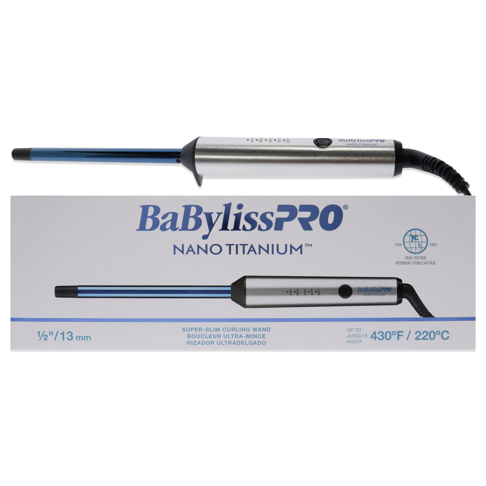 The BaBylissPRO Nano Titanium Wand evenly distributes high heat up to 430F to create long lasting curls with radiant shine. The slim design is lightweight and easy to handle for maxium comfort. Digital temperature control.