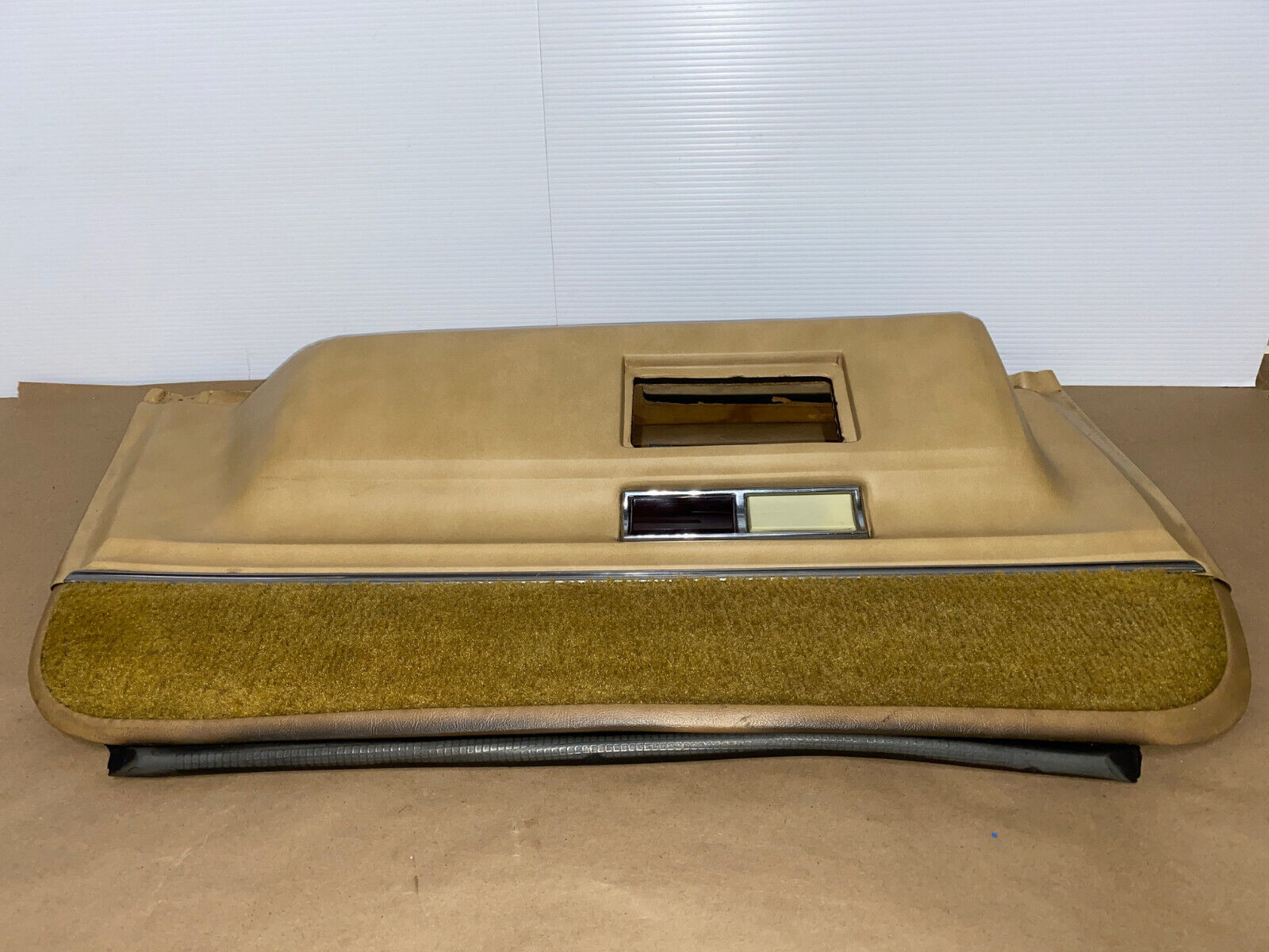 OEM driver side rear lower door panel is in good condition. There is a small crack in the top of the arm rest where the ashtray assembly mounts, which is common for these, but otherwise no cracks and overall fairly clean. Carpet is in very good condition, no major stains or tears. Chrome trim has a decent shine, Courtesy light is untested, so consider it free with purchase of the door panel. Cardboard backer is in good condition, not all water logged. Fits 4 door vehicles only. Please look at all pictures