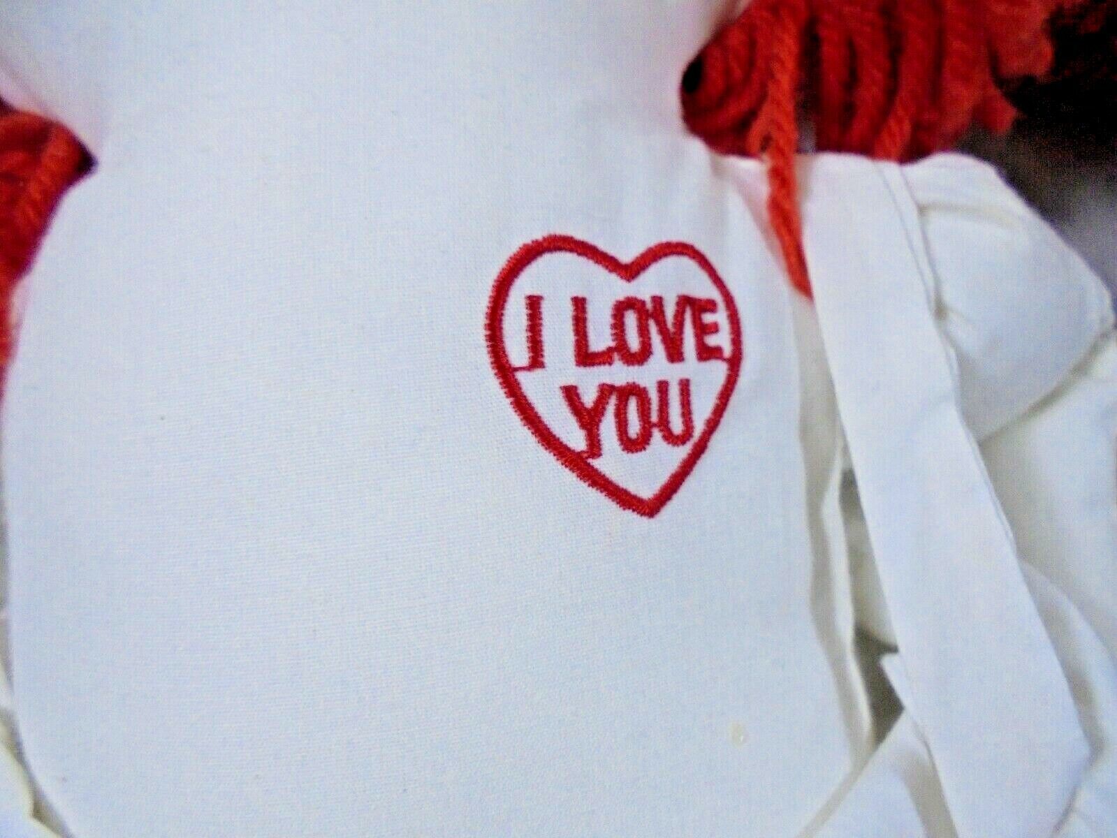 Fun nostalgic rag dolls. Don't know if homemade or not. Ann has white dress with "Raggedy Ann" in cursive. Andy has plaid shirt and green pants.