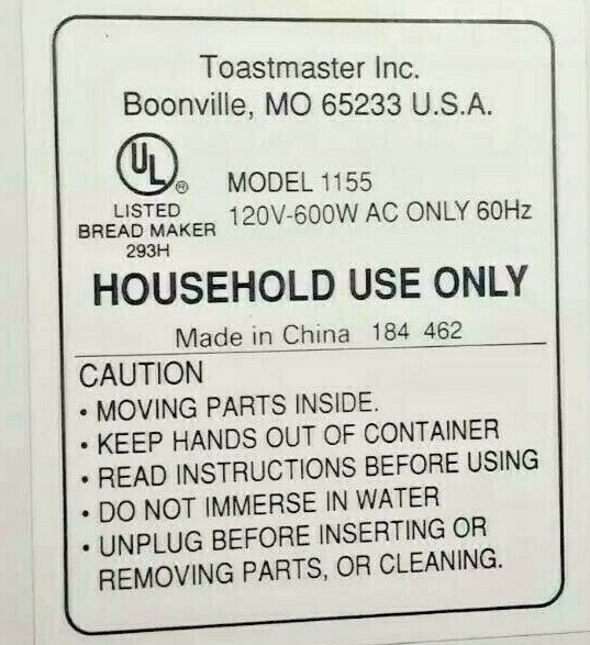 For Toastmaster Bread Maker models 1155 1157s |