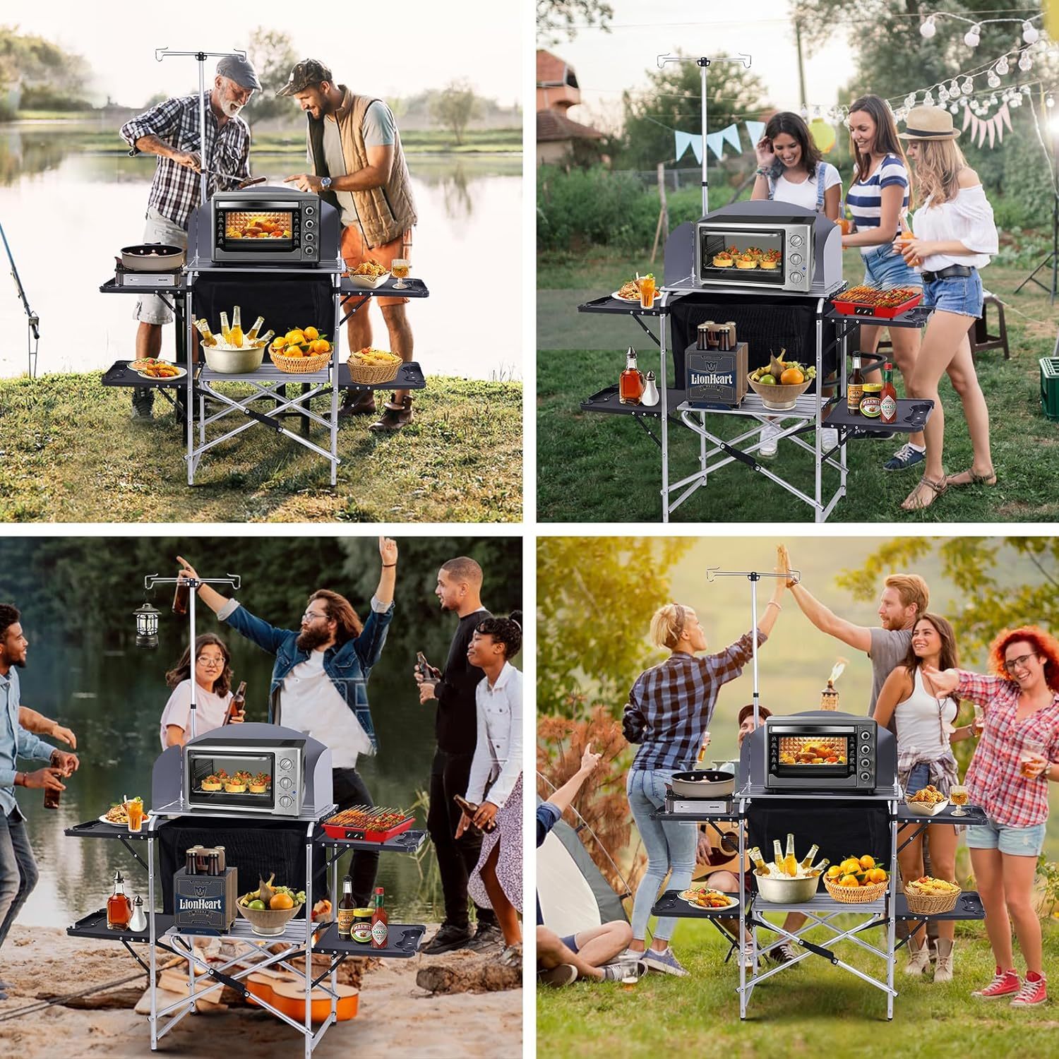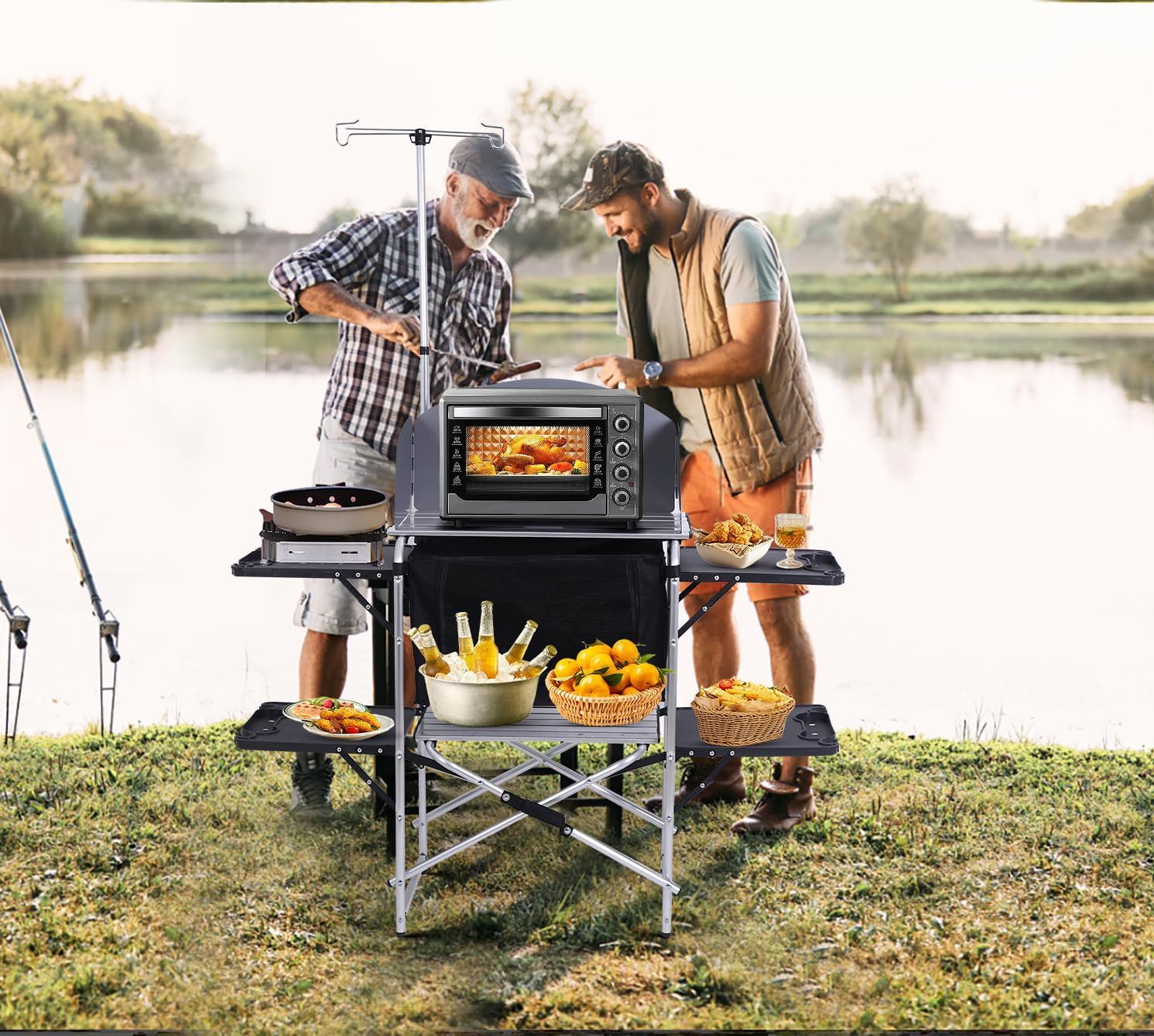 WHAT?S INCLUDED: This compact set includes a carry bag, two rolled-up middle tabletops, one table frame, one detachable windshield, one detachable central storage, and one height-adjustable light stand. LIGHT STAND INCLUDED: This camping kitchen station includes a light stand that ensures your camping cooking activities during the evening or night. This is especially valuable when preparing meals or cleaning up in low-light conditions. GREAT SIZE FOR ADULT COOKING: Not only it?s space-saving when you fold it up but a great height and length when you cook. The table height is 31.5 inches, and the full length is 52 inches. EXTRA ROOM STORAGE: Our Nice C folding camping kitchen stable also has four side tables available for extra room, it?s foldable when you prefer not to use it. Please try to make sure to use the side table with a balanced weight for both sides. SPACE-SAVING PORTABLE: The foldable table frame and all the parts will fit to the carry bag. Super space-saving! When you store everything in the carry bag, the folding dimension is 34.2 x 18.9 x 4.6 inches. The handled carry bag makes transportation a breeze.
