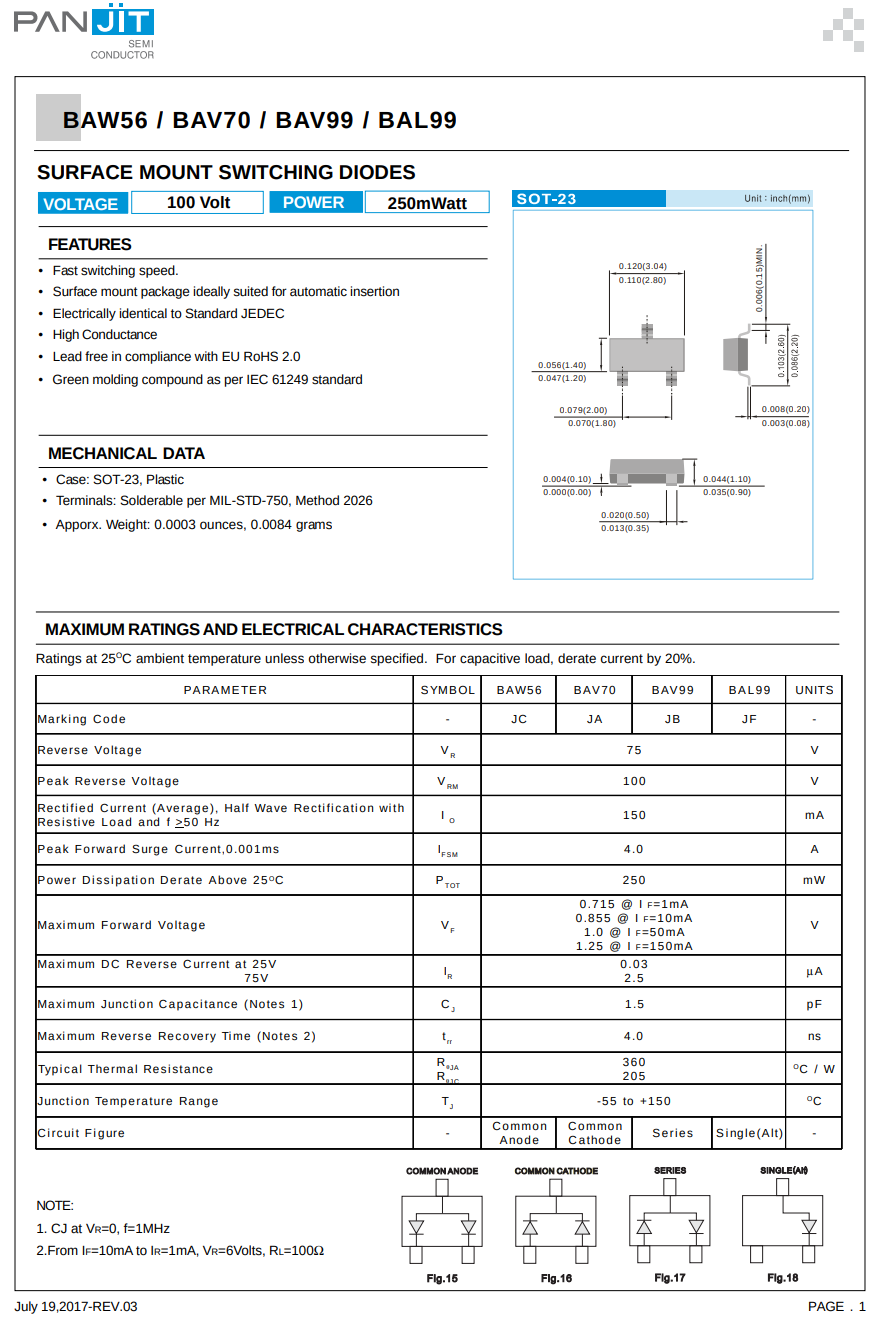100Pcs BAW56_R1_00001 Panjit SMD Switching Diode 75V 150mA Common Anode SOT-23