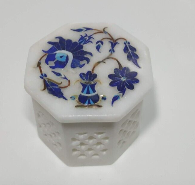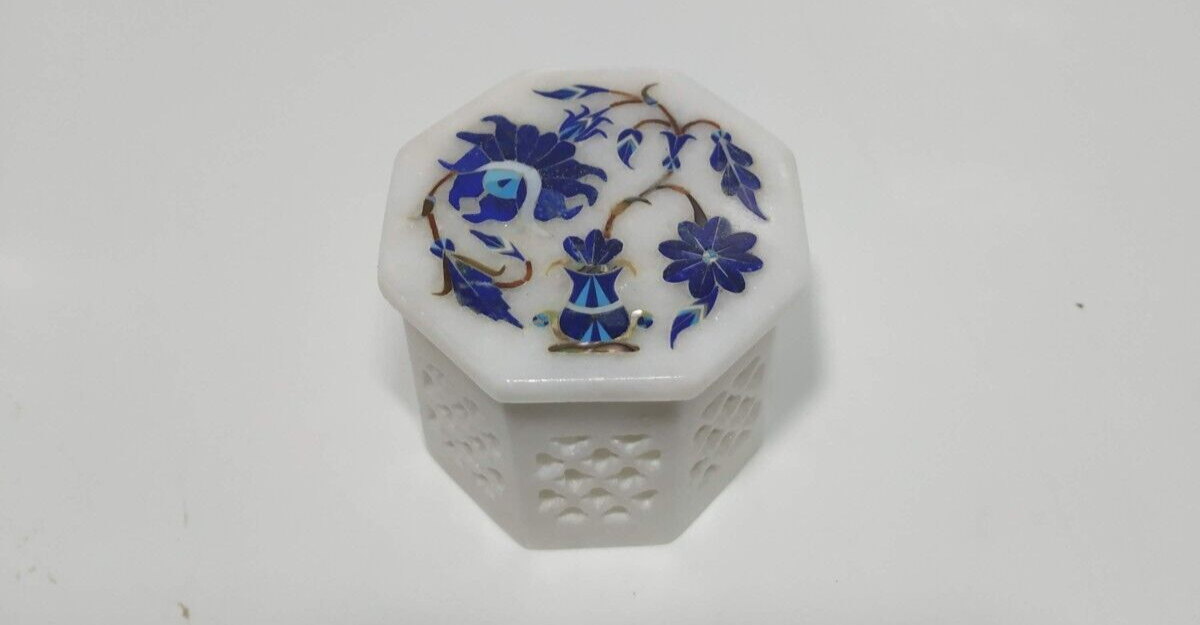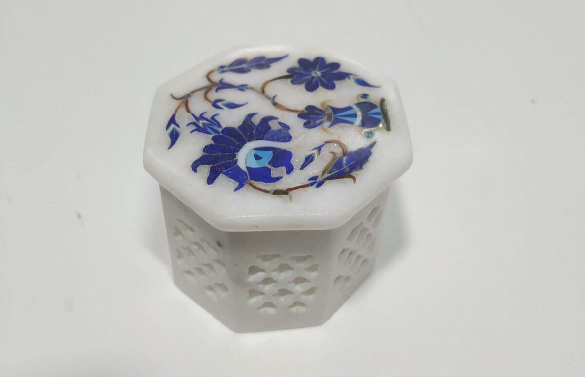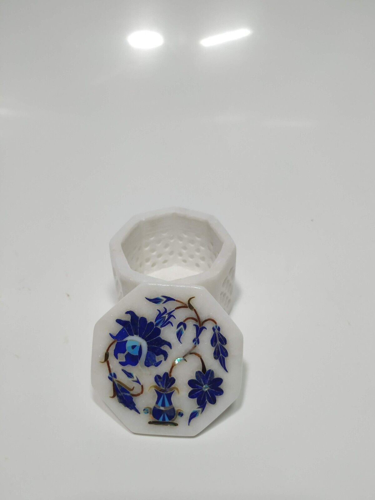 White Marble Octagon Shape Trinket Box with Royal Look Semi Precious Stone Inlay