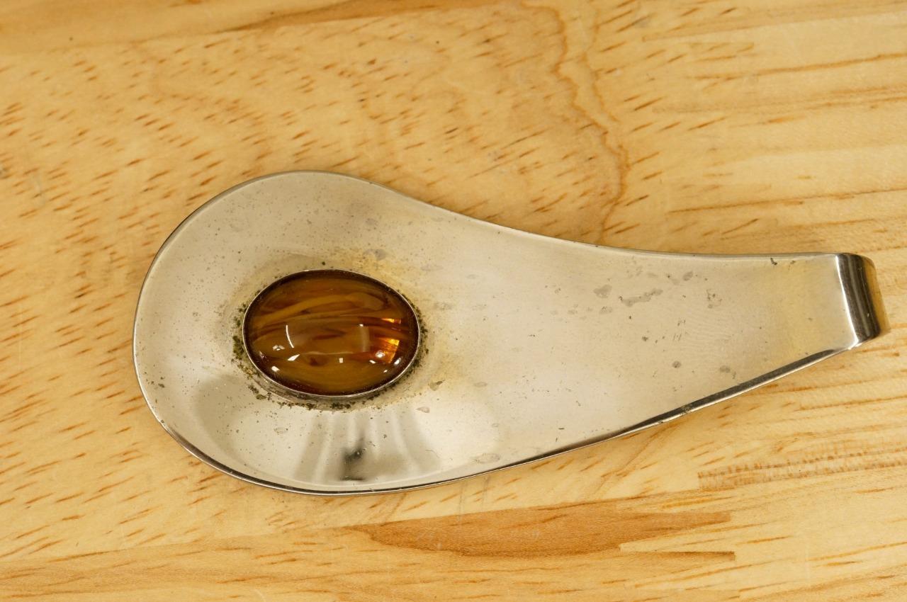 Vintage Costume Jewelry Silver Tone Metal Striped Amber Glass Necklace Pendant. 1970's MCM Mid Century Modern. Measures 3" long. Will need a gentle polish. Smoke and pet odor free. Ready to hang on your favorite chain or work into your own creation.