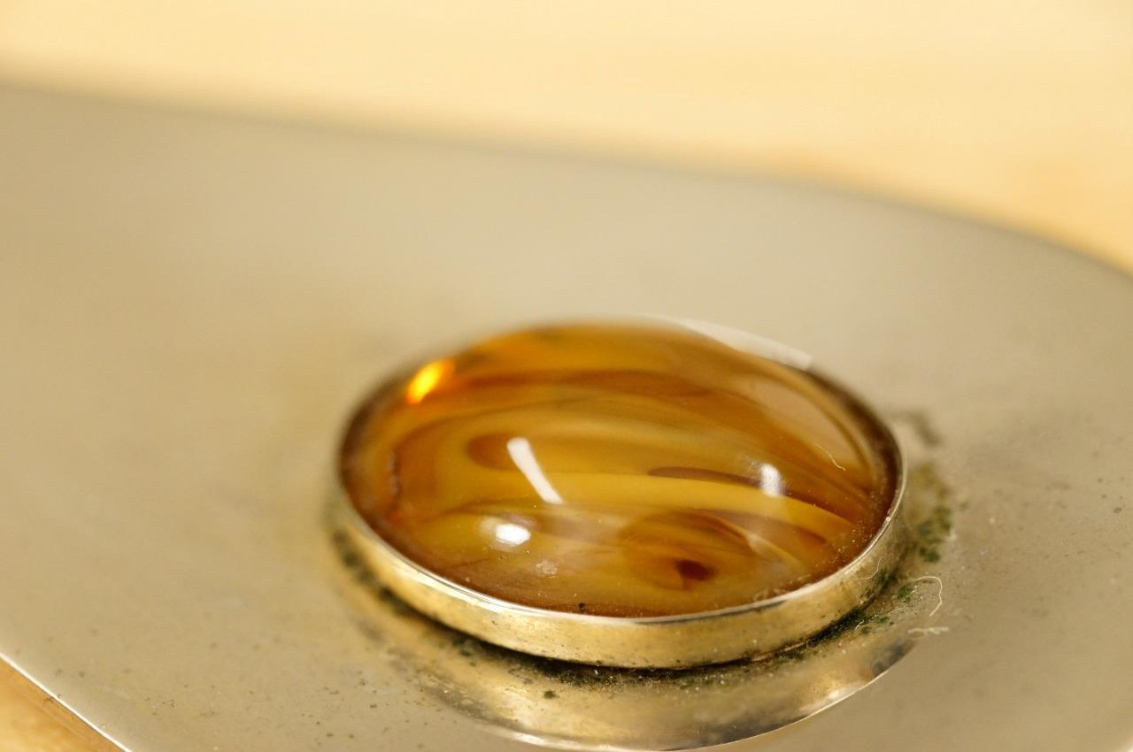 Vintage Costume Jewelry Silver Tone Metal Striped Amber Glass Necklace Pendant