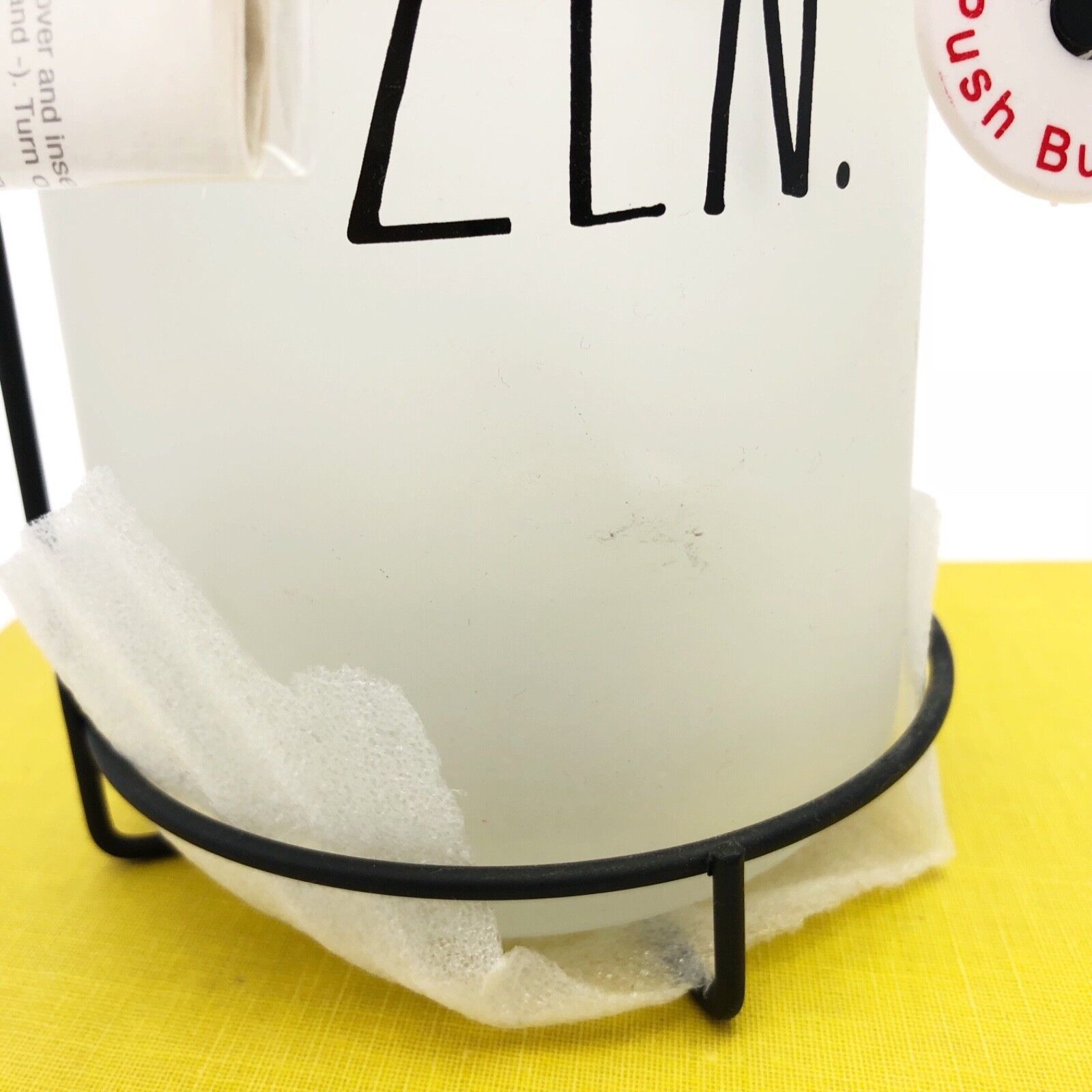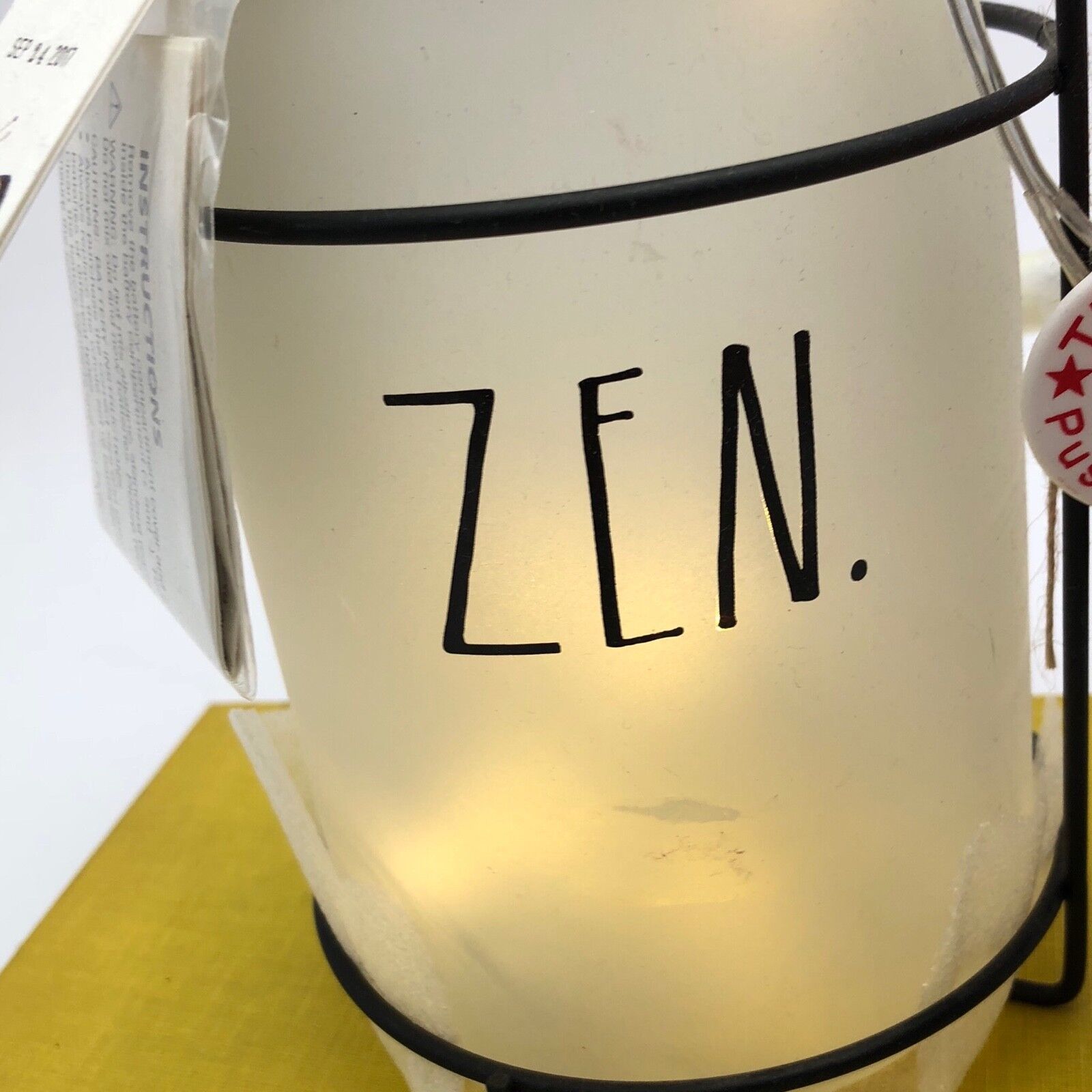 This is a brand new Rae Dunn Zen Mason Jar Lantern with bail handle. In the screw-top metal lid, there is a place for two AAA batteries to light up the frosted jar. With "Zen" on the side in black, it is very pretty and looks lovely lit.