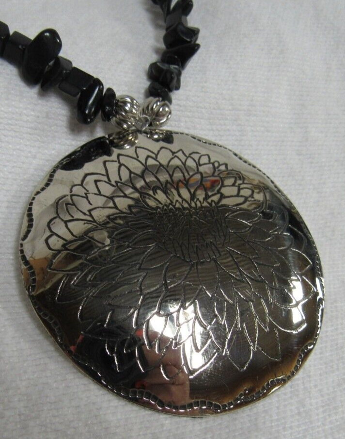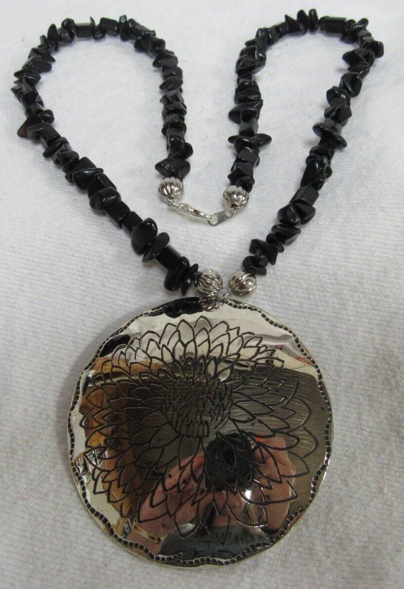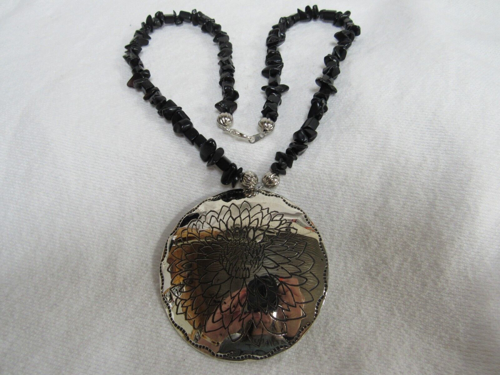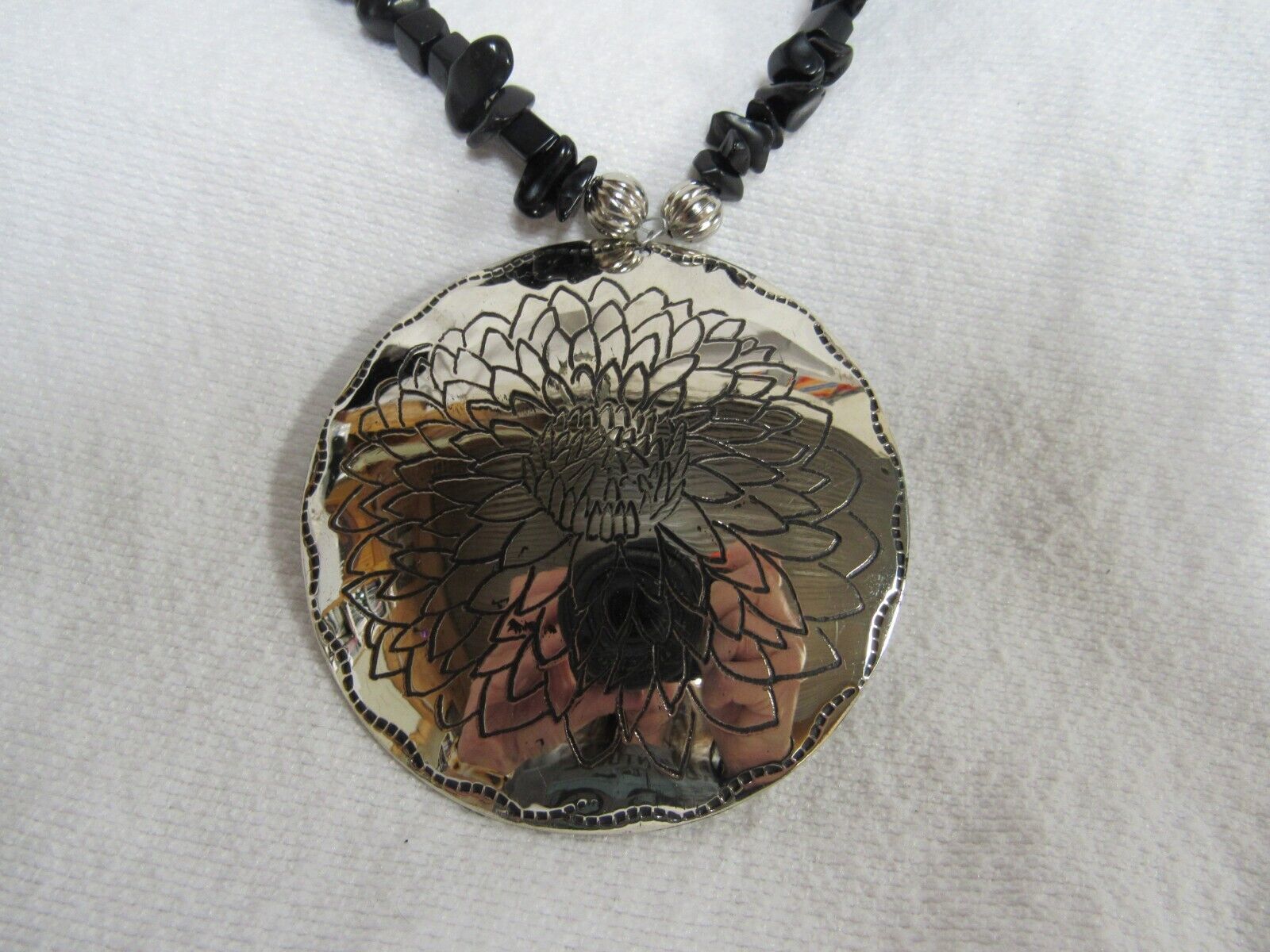 Here at Debi's Attic Gold in Wewoka, Oklahoma we have a New Native American Seminole, Dahlia Flower Medallion with a Black Rock Necklace Handmade by Charley Johnson, a local Seminole Tribal Member.