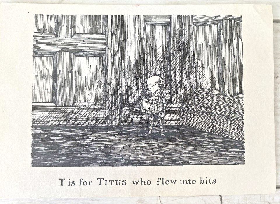 Vintage T is for Titus who Flew into Bits Alphabet Letter Edward Gorey Postcard