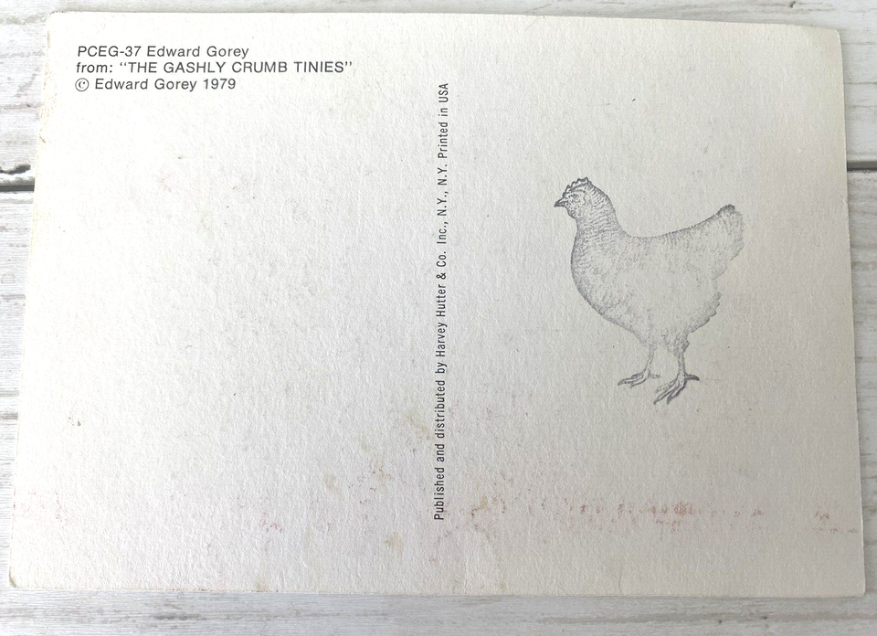 The item for sale is a Vintage T is for Titus who Flew into Bits Alphabet Letter Edward Gorey Postcard.