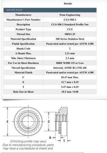 50-PEM PENN ENGINEERING CLS-M8-2 Stainless Self-Clinching Panel Nut M8 X 1.25