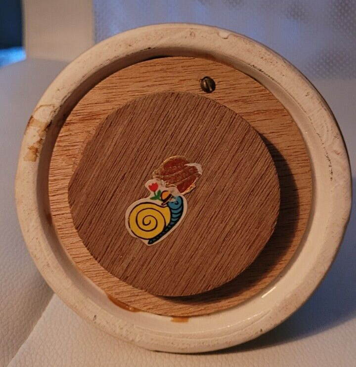 This music box is in good used condition. It is tested and works well. It measures 6.25 inches tall. 4.5 inches wide round base. It would make a nice addition to a collection.