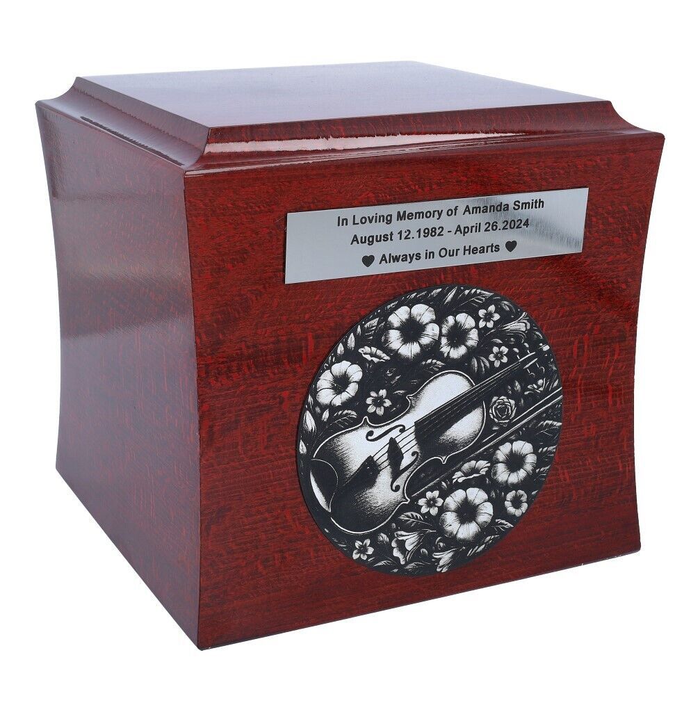 This urn features a box-like shape with slightly rounded edges, giving it a contemporary yet timeless look. The rich mahogany finish enhances the natural beauty of the wood. The front of the urn is adorned with a meticulously engraved image of a violin lying among flowers, symbolizing the beauty and tranquility of music. Additionally, a personalized memorial plaque is situated on the front, allowing you to add custom text such as the name of your loved one, important dates, or a personal message. This creates a unique and heartfelt tribute.