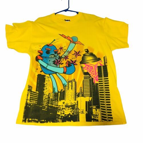 This vintage t-shirt features a unique print of a robot battling a hairspray can, giving it a one-of-a-kind look. The shirt is made for men and is a size L. The brand, type, and department are all included in the listed aspects. This shirt is perfect for anyone looking for a statement piece to add to their wardrobe.