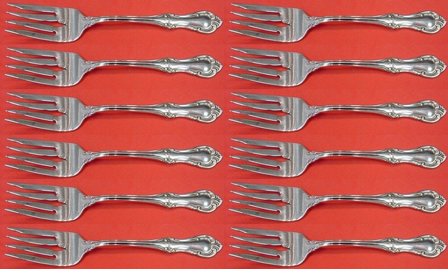 Sterling Silver Salad Fork 12-piece set, 6 1/8" in the pattern Joan of Arc by International. It is not monogrammed and is in excellent condition.
