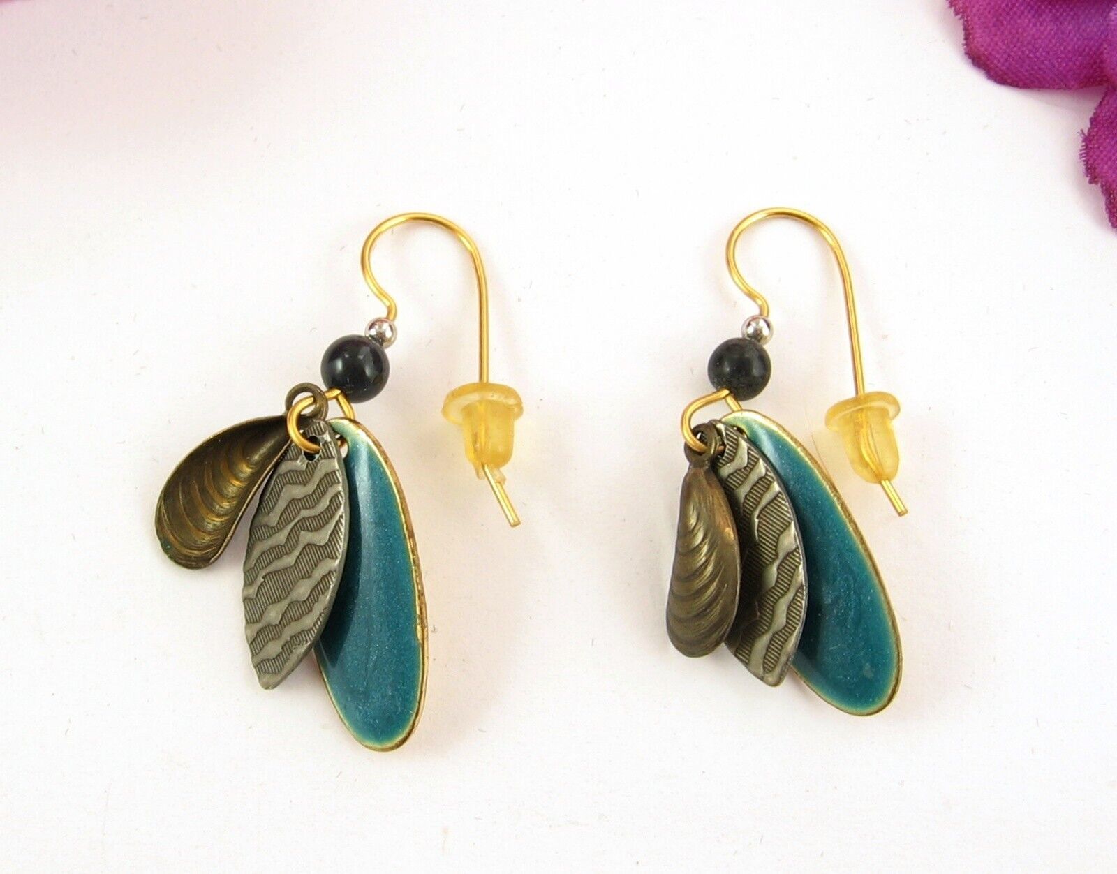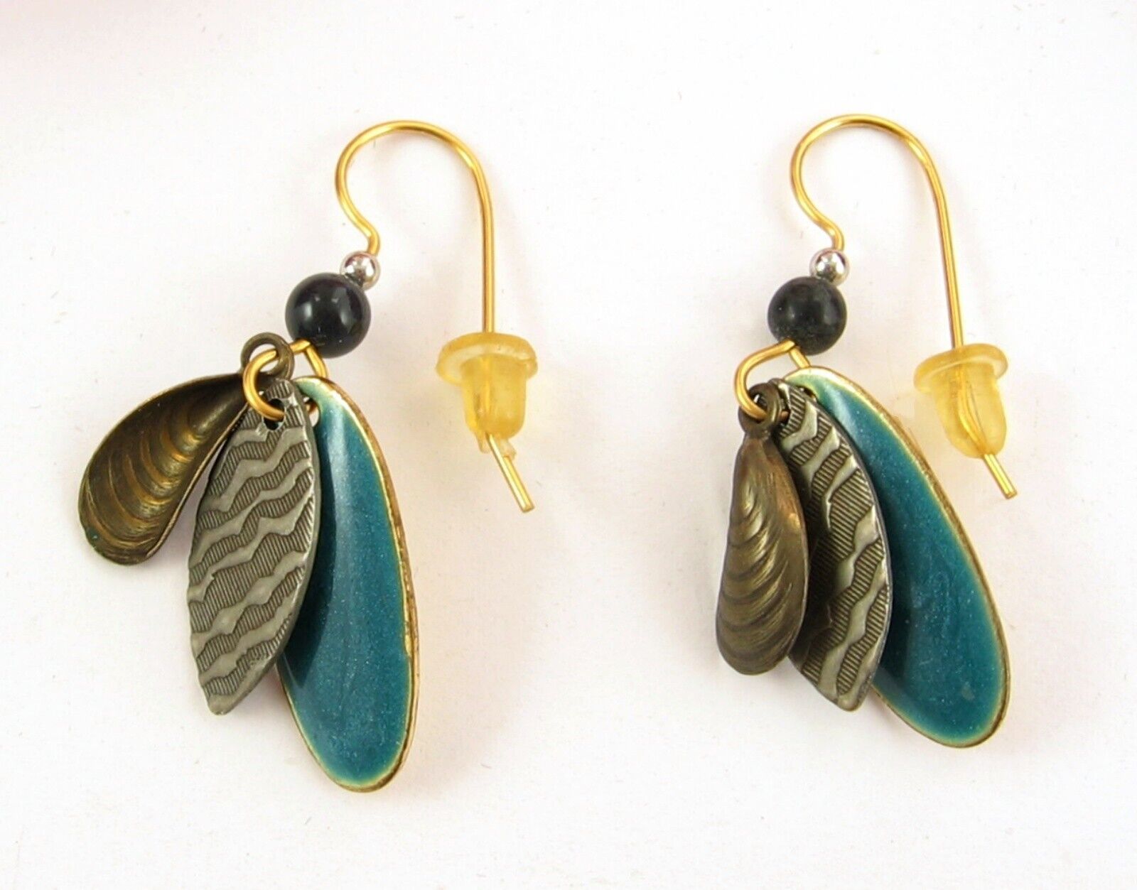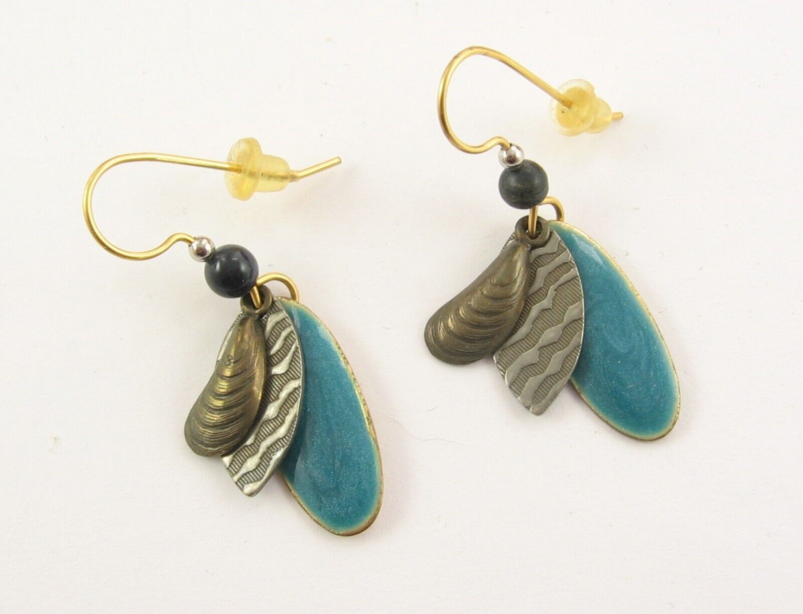 In a goldtone metal, this pair of vintage Earings each have THREE DANGLE pieces! The one in front is an OYSTER SHELL made of metal. Behind it is a textured football shaped metal piece and the one in the back is a long piece decorated in a dark blue-green to turquoise-color shimmery enamel!