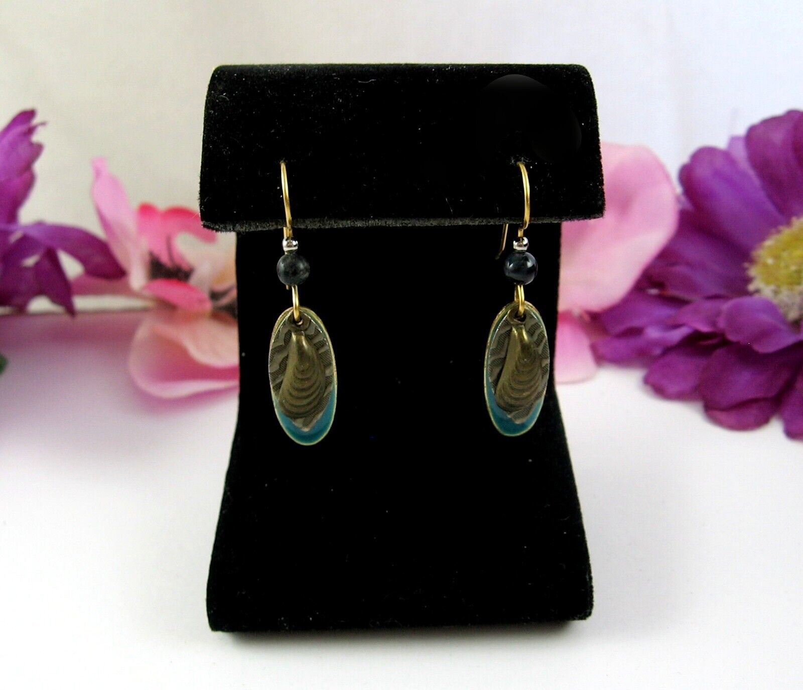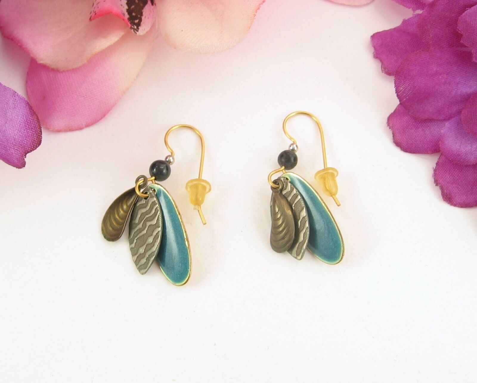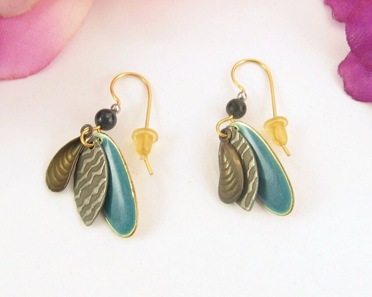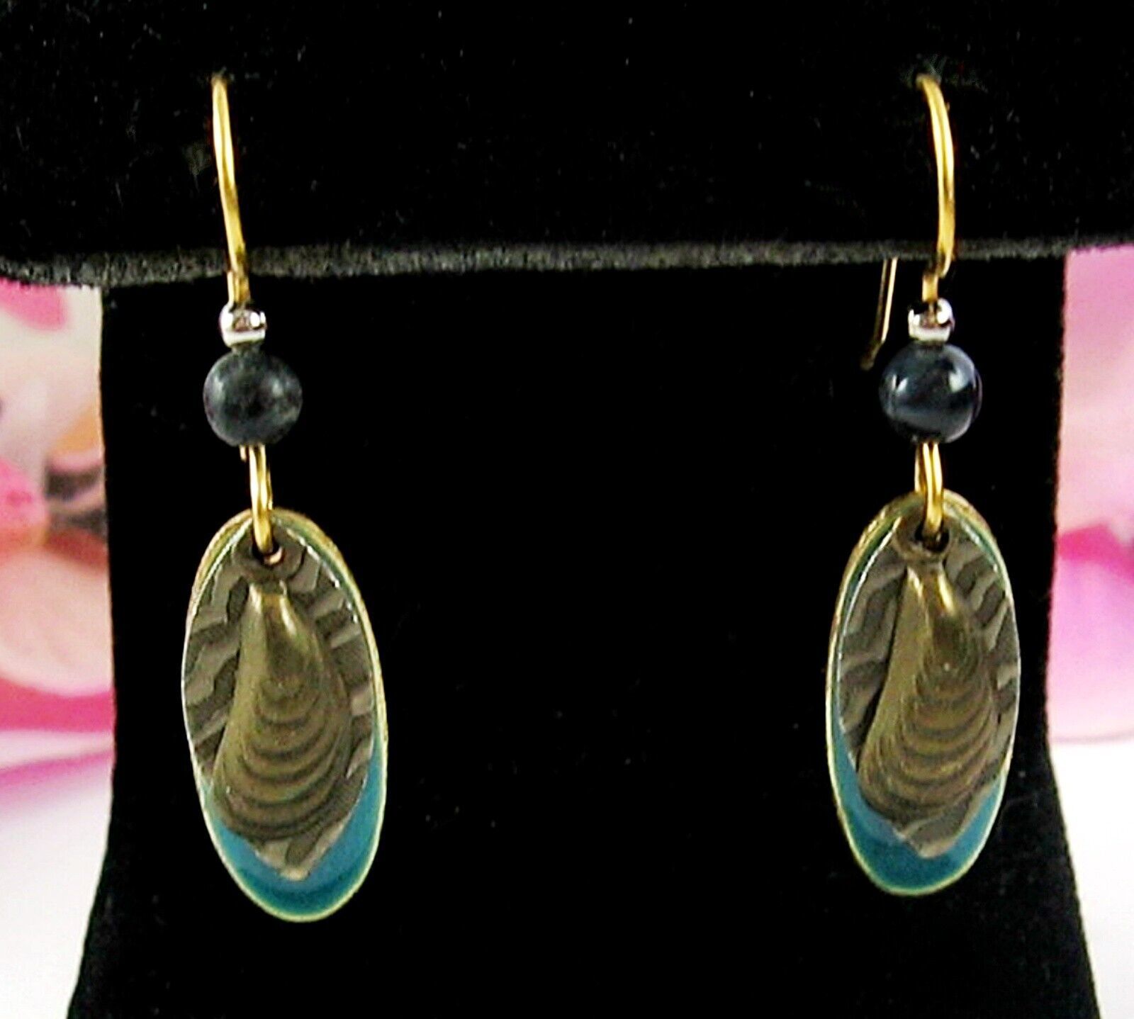 In a goldtone metal, this pair of vintage Earings each have THREE DANGLE pieces! The one in front is an OYSTER SHELL made of metal. Behind it is a textured football shaped metal piece and the one in the back is a long piece decorated in a dark blue-green to turquoise-color shimmery enamel!