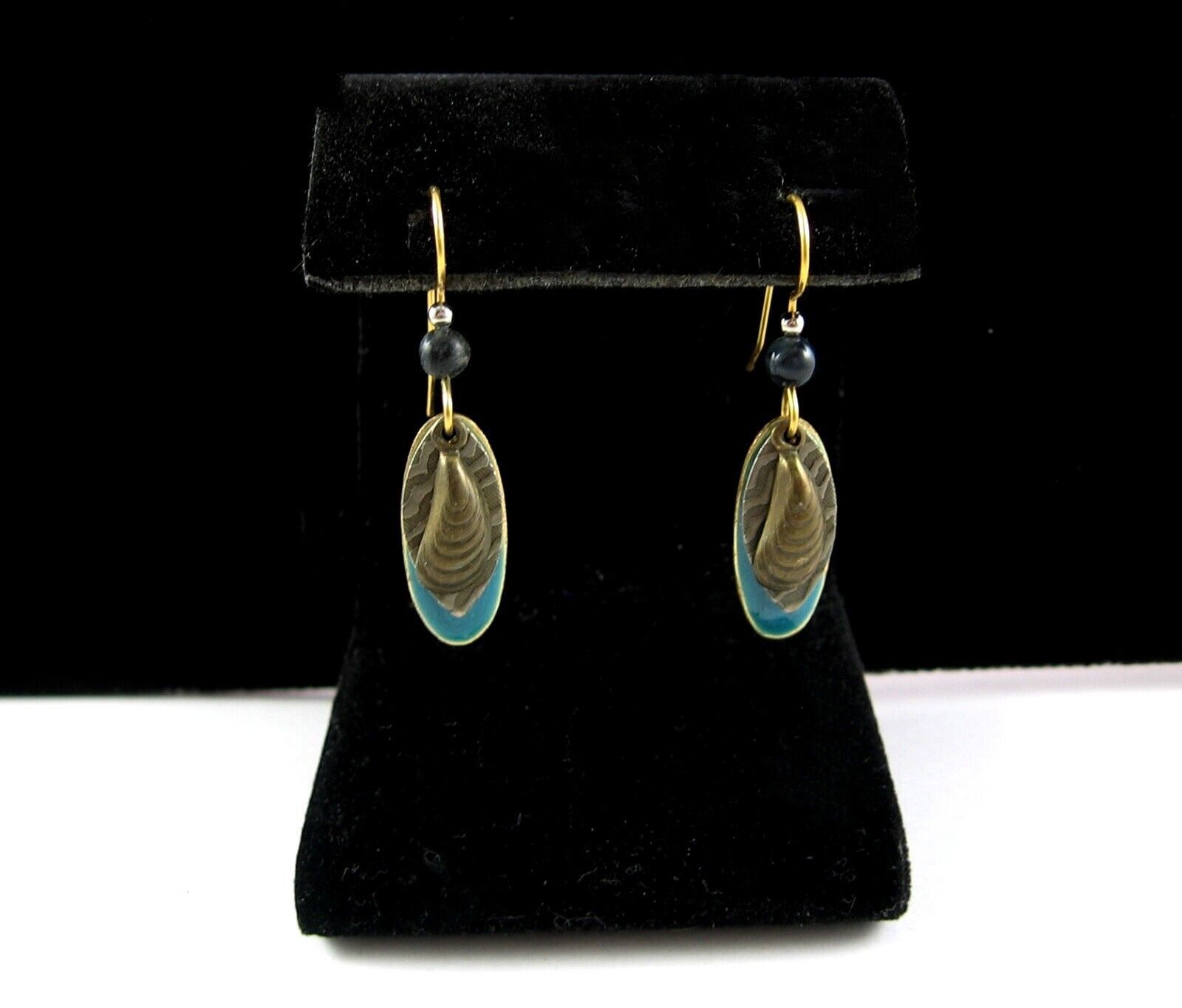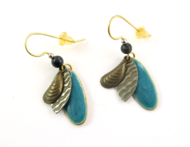 OYSTER SHELL Blue Enamel LEAF Vintage Dangle EARRINGS Pierced Wire Goldtone 1.5"