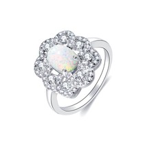 "Complete your look with this stunning Lab-Created Opal and White Topaz Flower Frame Ring. Crafted in sterling silver, this ring features a beautiful flower design with opal and white topaz stones. The lab-created opal offers a durable and radiant shine, while the white topaz adds a touch of elegance. Perfect for any occasion, this ring is a must-have for any jewelry collection."