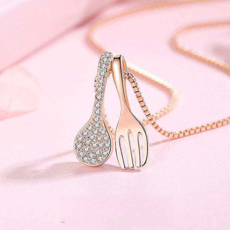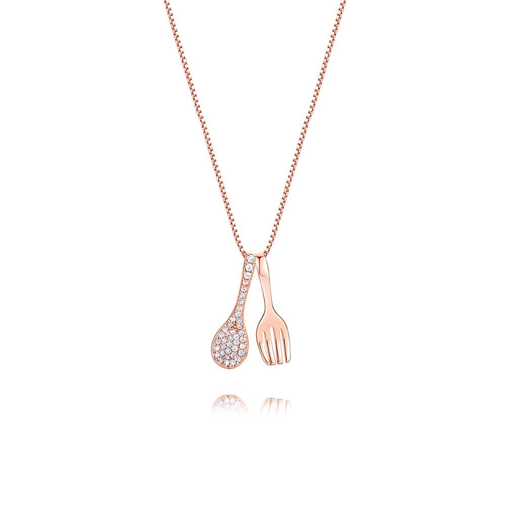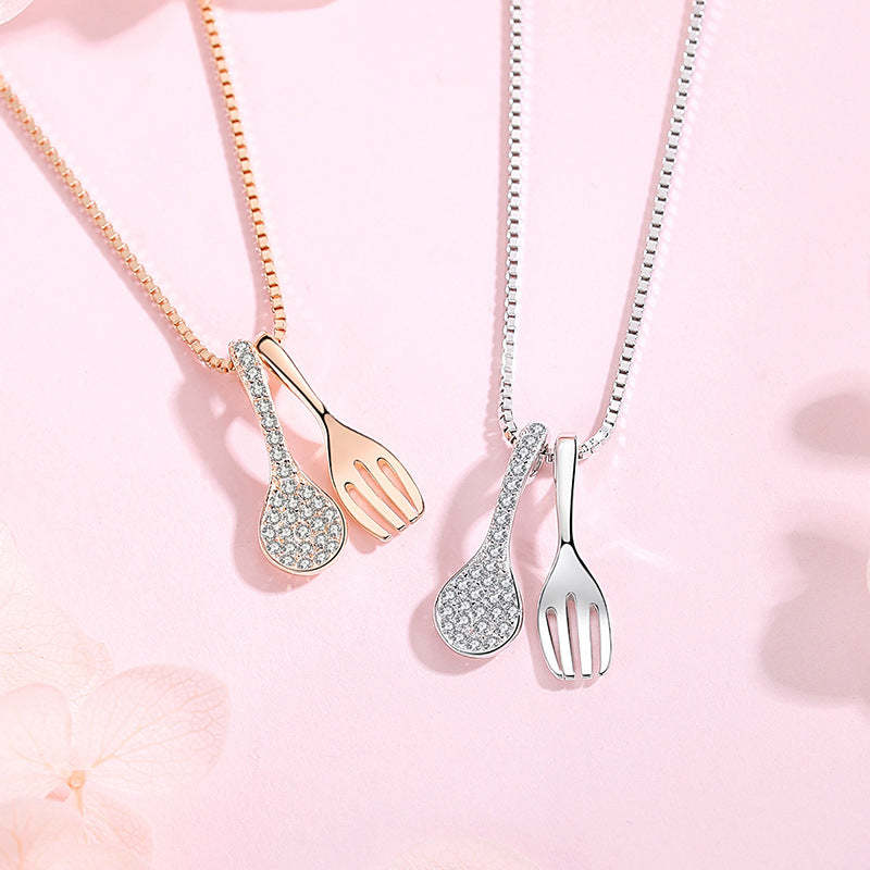 This elegant 925 silver clavicle chain showcases a small fork and spoon adorned with sparkling diamonds. The perfect accessory for any mealtime enthusiast, this necklace adds a touch of sophistication and charm to any outfit. Give the gift of culinary style with this unique and dazzling piece.