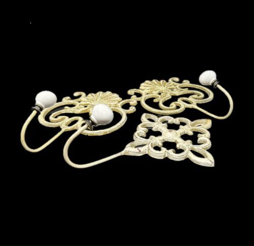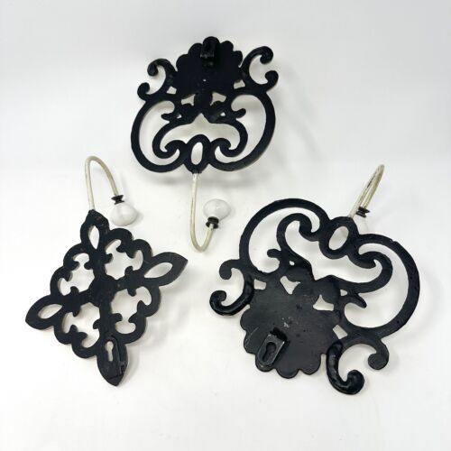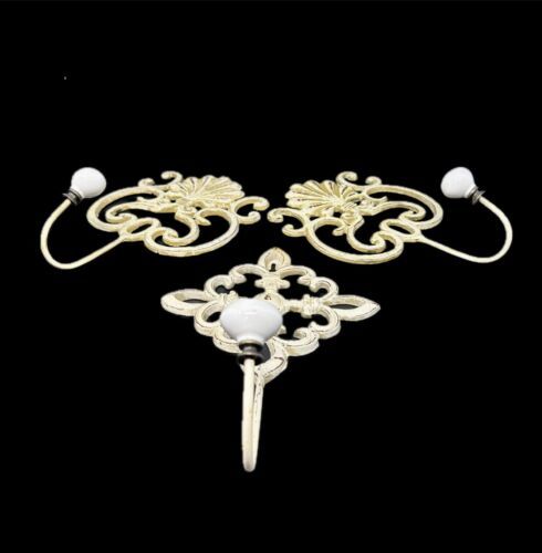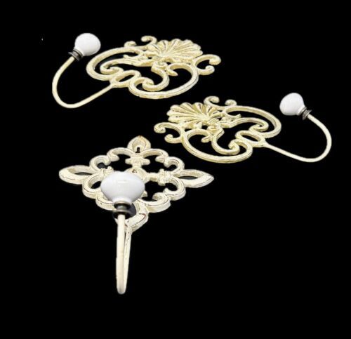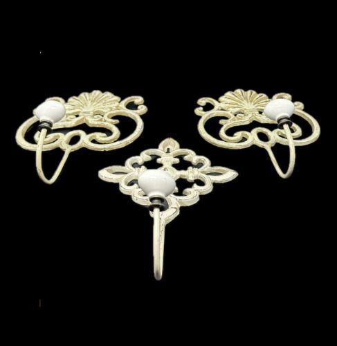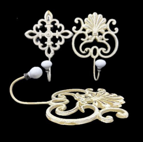 Offered are 3 decorative cast iron wall hooks. The slightly large two have a scrollwork design with an shel motif at the top. The smaller hook is made up of 4 flour de lis in the form of a diamond. Each hook is painted in a creamy butter and distress with accents of brown. The white oval porcelain knobs screw onto the hooks. The hooks are made of solid cast iron and are easy to install with a wide head nail. All three pieces are in excellent preowned condition. There is no breakage, scratch marks, or repairs found. Please see all photos for more detail on condition.