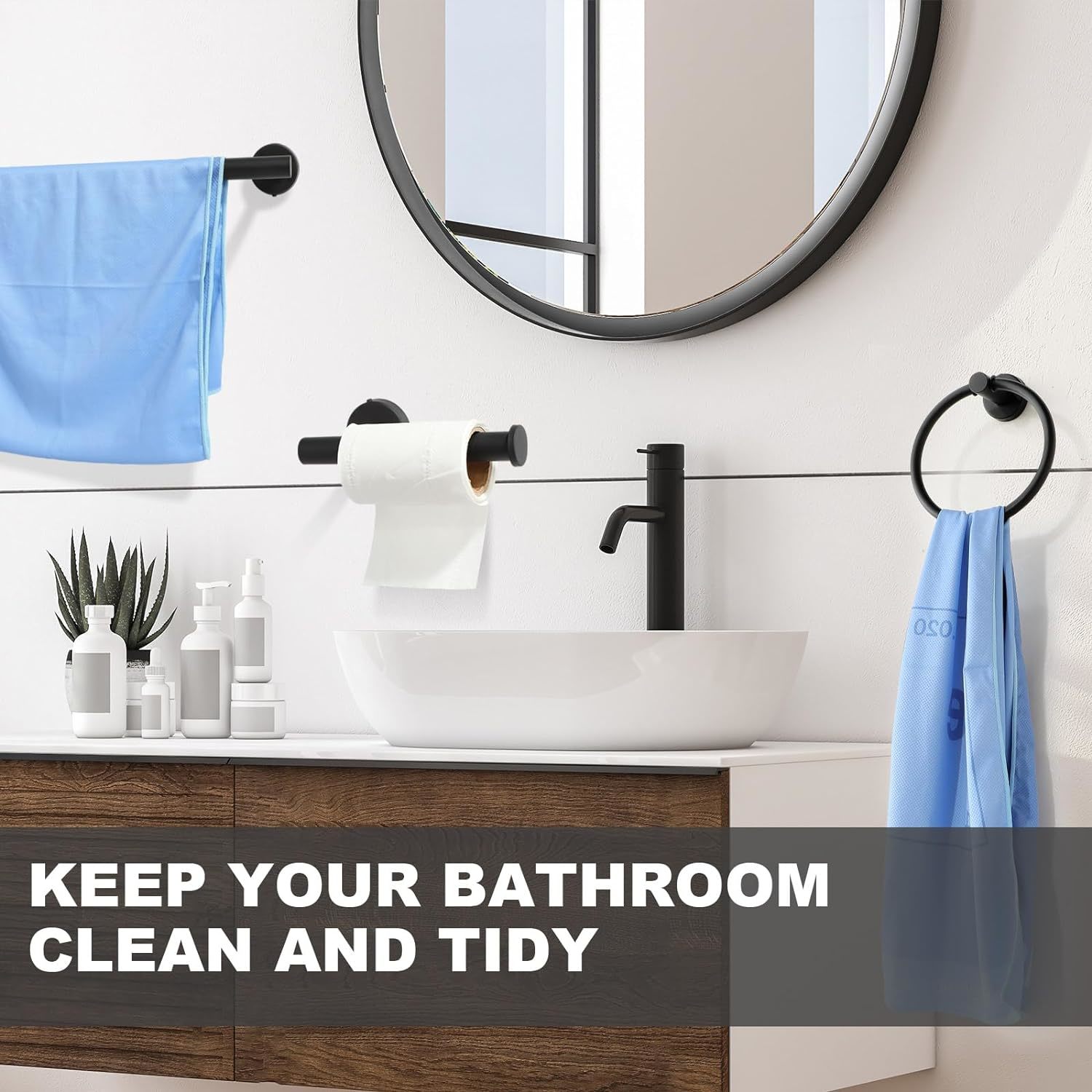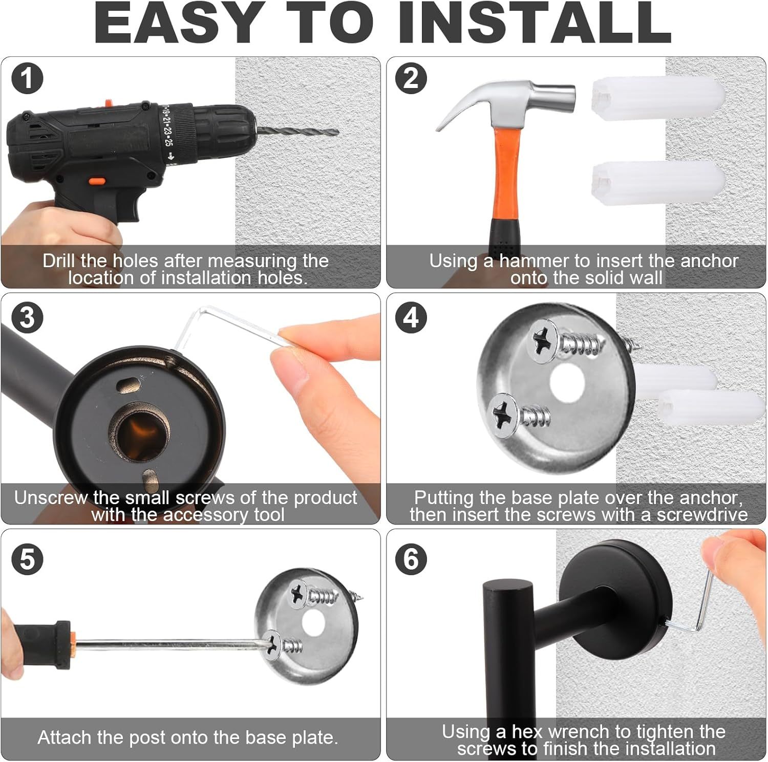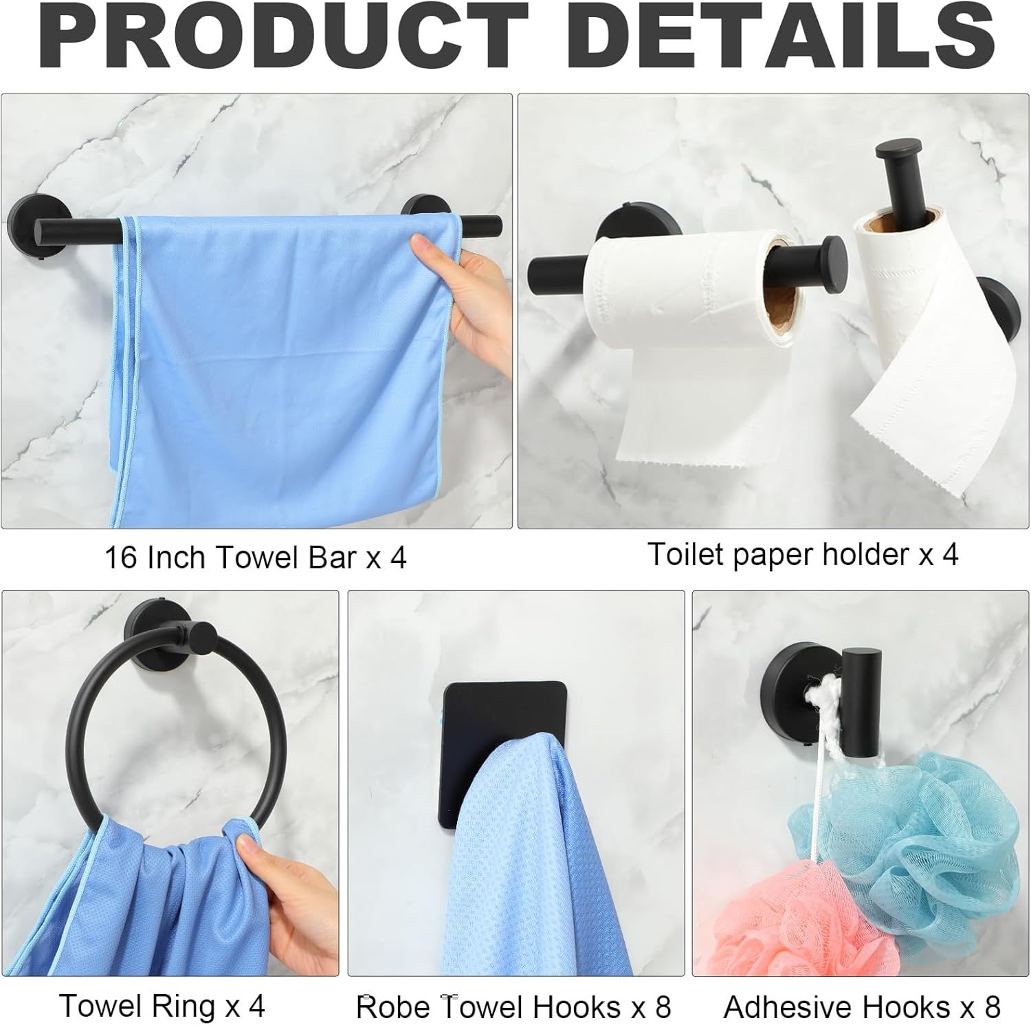 Quality Bath Hardware Set: the matte black bathroom accessories are made of SUS304 stainless steel material; 4 pcs of 16 inches towel bar, 4 pcs of toilet paper holder, 4 pcs of towel ring, 8 pcs robe and towel hooks, 8 pcs adhesive hooks; Plus, The metal construction makes sure you get years of use out of this matte black bathroom hardware set Stylish Modern Bathroom Accessory Set Design: the matte black bathroom accessories set is designed with clear lines and sturdy construction; Delicate shape and concealed mounting hole add a touch of modern design to your bathroom; The matte black bathroom hardware kit can match your black shower faucet and bathroom faucet well Matte Black Surface: the matte black finish brings beauty to your kitchen or bathroom and resists spots and scratches to ensure elegant appearance; The delicate finish protects it from corrosion and rust in the damp environment and enhances durability; This feature means that you will spend less time on maintenance through everyday use Easy to Install: the bathroom hardware set matte black come with all the mounting accessories needed, quality stainless steel screws and anchors which are of reliability and the screws are concealed that gives it a neat and attractive look; Available in various finishes, you can mount it to any flat surface, bathroom wall, Sheetrock walls or wood door Multifunctional Use: the matte black bathroom accessories with space saving design fits well into bathroom, kitchen cabinet, cloakroom, bedroom, laundry room, toilet and gym; The edge of bathroom hardware is polished smoothly so that it is not easy to scratch towels or clothes; You can safely hang bathrobes, bath towels, pants, shirts, swimsuits, jackets, bags, shower caddy or other items