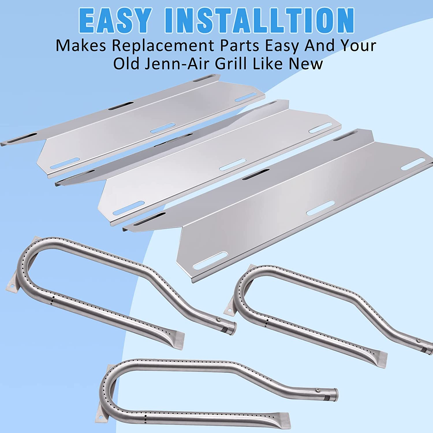 Renew your Jenn-Air 720-0336 720-0337 730-0337 grill with these grill replacement parts. Freshen the looks and performance of your grill parts, to enhance the life span of your jennair grill. Package consists of 3pcs stainless steel grill burners, 3pcs stainless steel heat shields, 3pcs grill igniters.
