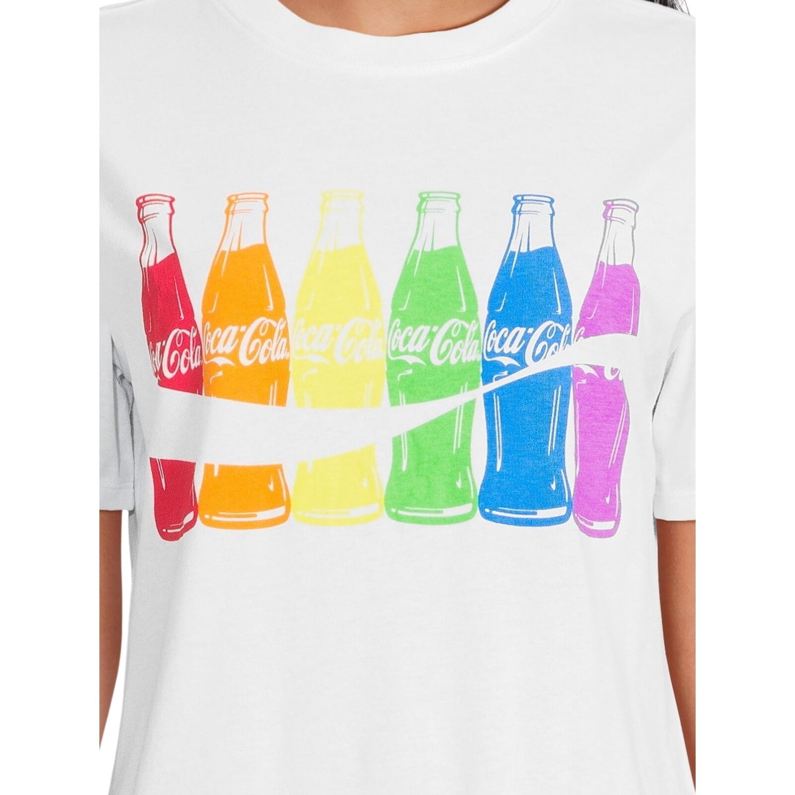 Sweeten up your tee collection with this Coca-Cola Graphic Print T-Shirt. Crafted in a soft, comfy lightweight cotton-blend jersey, this skimmer T-shirt features a colorful graphic print of the iconic Coca-Cola bottles for a touch of vintage-inspired style. The crewneck, short sleeves, subtly cropped length and relaxed fit keep it classic. Perfect for adding cool, refreshing vibes to any outfit.