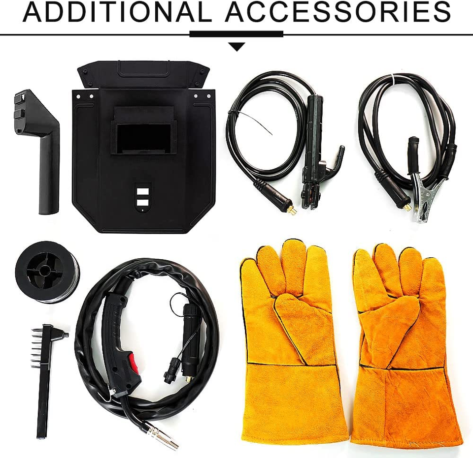 Mask, ?Pair of accessories, Pair of Gloves, Weld Machine Whit 2 x 1.5m welding wire ( MMA MIG ) and 1.5m ground clamp line, Steel brush