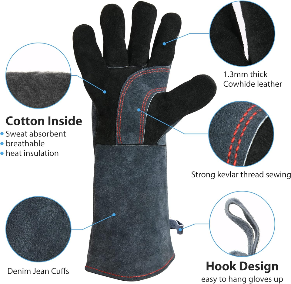 Safety: 16-inch extra-long gloves can protect your forearms from grinding debris, cutting sparks, hot coal and open flames, hot kitchen utensils and hot steam. welding gloves are guaranteed to withstand extreme temperatures up to 932F(500?).Ideal for welding, Cutting, forging or other high temperature applications.
