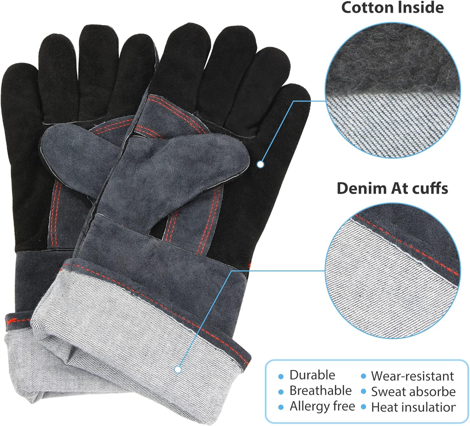 Gloves Material: The welding gloves made of high quality material,with three layers - Outer layer: 1.3mm thick cowhide leather; Fire/ heat protection layer: air-isolated aluminum foil; Inner layer: insulated cotton lining);Flame-retardant seam. Durable,high heat resistance and cold resistance, sweat absorption, breathable