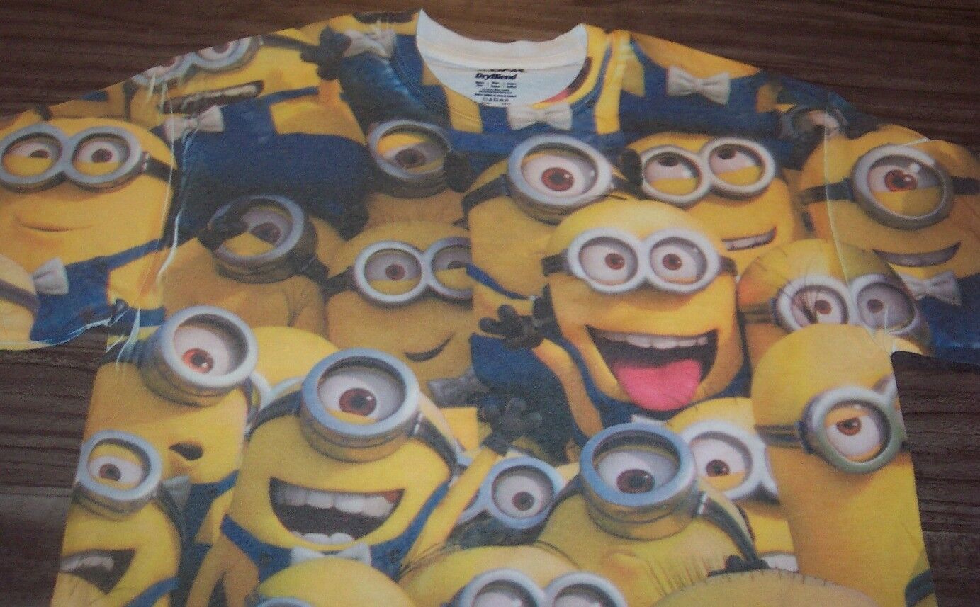 This is a DESPICABLE ME MINONS T-shirt. It is a size SMALL and it is NEW. It is 18 1/2 inches from armpit to armpit and 27 inches in length. Combine auctions to save on shipping. AD