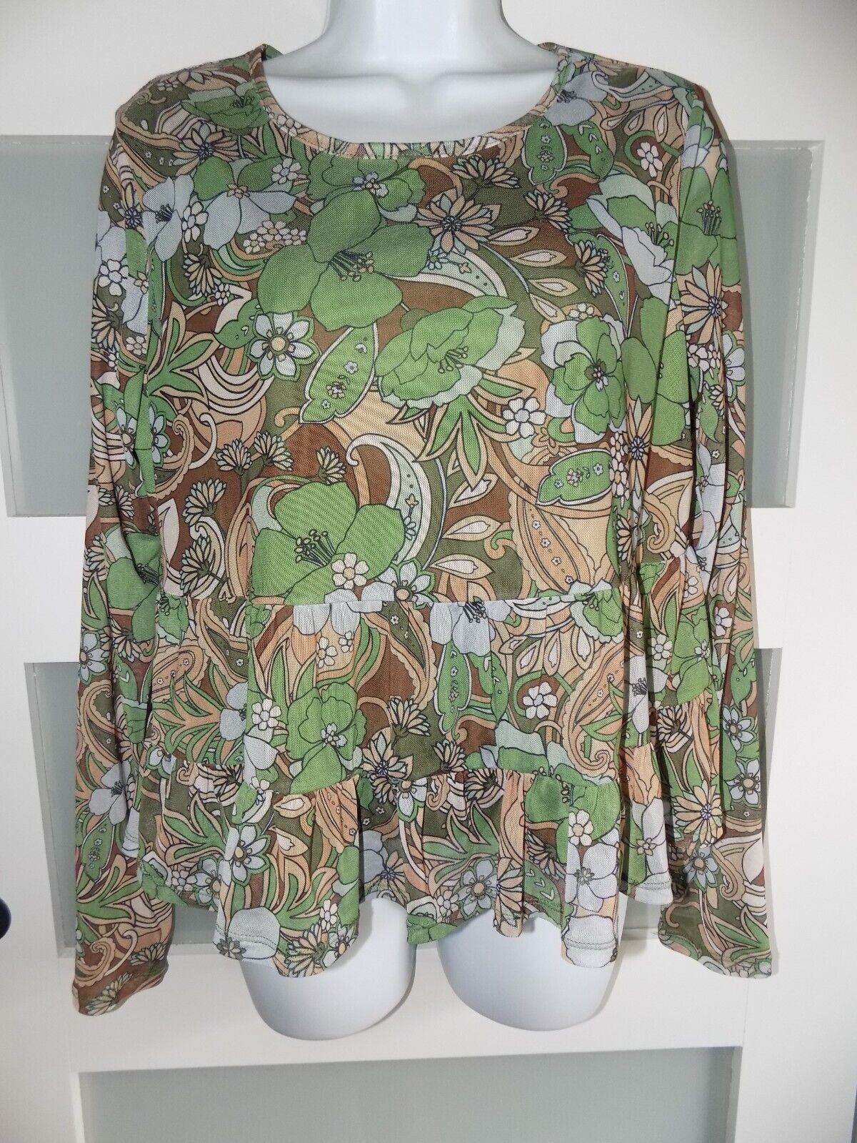 Love,Fire LS Green Floral Layered Babydoll Shirt Size L Women's NWOT