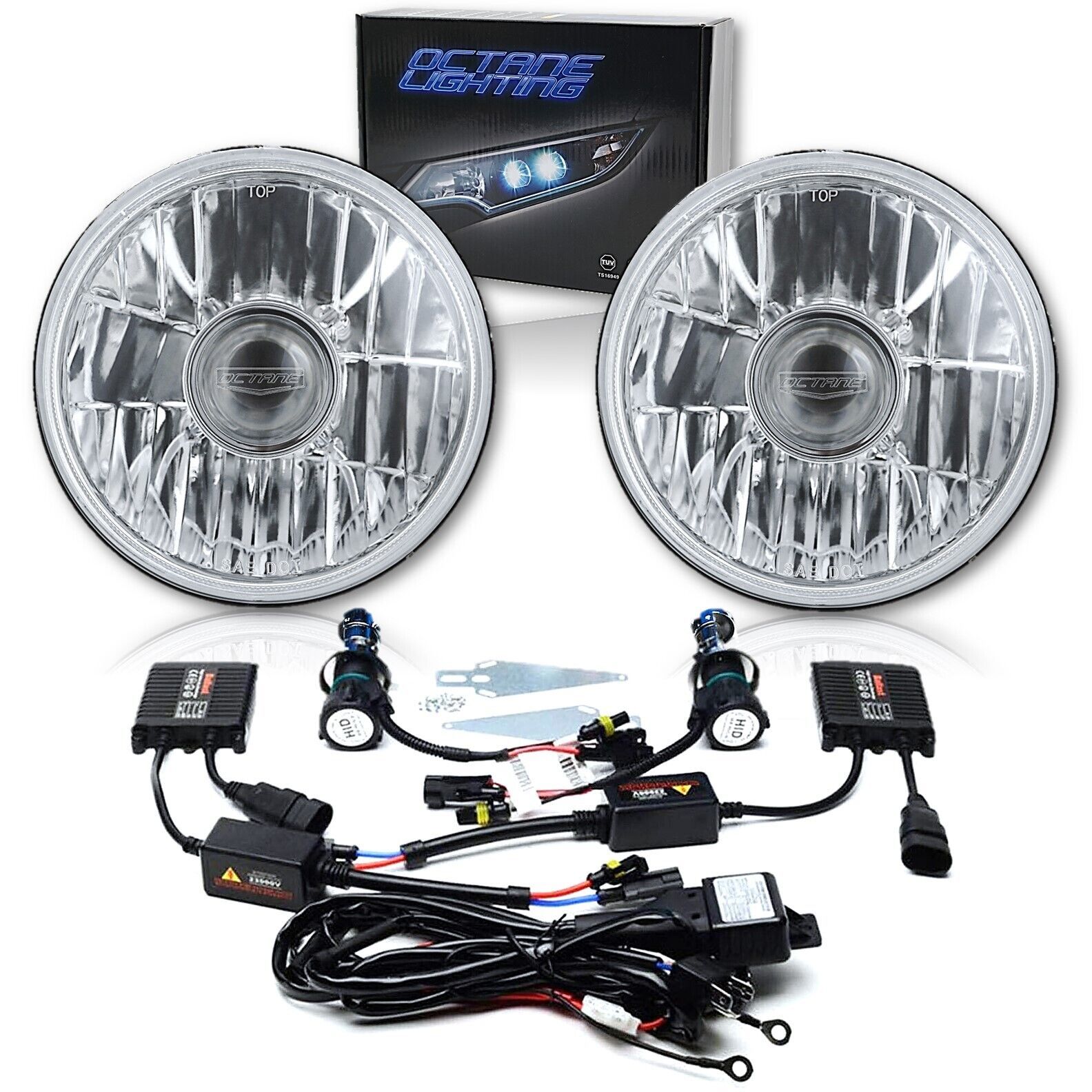 THIS LISTING IS FOR A NEW PAIR (2 Bulbs) OF 7" ROUND 12 VOLT HIGH/LOW BEAM CRYSTAL CLEAR H4 CONVERSION HID PROJECTOR HEADLIGHTS. INCLUDES 6000K BI-XENON HI/LOW SUPER WHITE HID KIT. THESE ARE GLASS FACED / METAL BACKED HEADLIGHTS. THESE ARE VERY GOOD QUALITY AND VERY BRIGHT! THESE HEADLIGHTS HAVE A DOMED CLEAR GLASS FACE UNLIKE ALL ALL THE OTHERS ON THE MARKET THAT HAVE A FLAT PLASTIC FACE. THESE ALSO FEATURE A METAL BACKSIDE UNLIKE MOST OF THE PLASTIC BACKED HEADLIGHTS ON THE MARKET. THIS SET INCLUDES (2) HEADLIGHTS WITH (2) 6000K HID BULBS, (2)