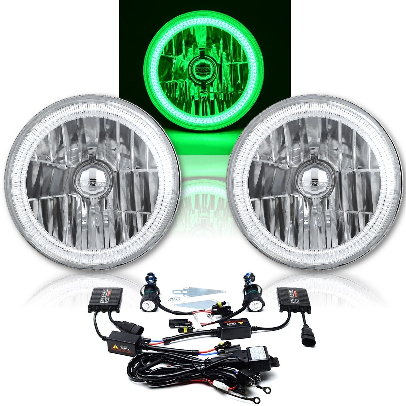 THIS LISTING IS FOR A NEW PAIR (2 bulbs) OF 7" 12 VOLT HIGH/LOW BEAM 6000K HID HEADLIGHTS WITH GREEN COB LED HALO ANGEL EYE RINGS. THESE HALO RINGS ARE EXTREMELY BRIGHT AND CAN EASILY BE SEEN DURING THE DAY AND NIGHT EVEN WITH THE HEADLIGHT ON. THESE HEADLIGHTS HAVE GLASS LENSES. THESE ARE A NIGHT AND DAY DIFFERENCE IN BRIGHTNESS COMPARED TO STOCK BULBS. THIS SET INCLUDES 2 LOW/HIGH BEAM HEADLIGHTS WITH 35W HID LIGHT BULBS AND H4 TO H13 ADAPTER WIRING PLUG. INCLUDES RELAY HARNESS THAT HAS THE ORIGINAL SHAPED PRONGS ON THE CONNECTOR SO IT WILL PLUG RIGHT INTO YOUR ORIGINAL WIRING HARNESS PLUG. THE STOCK FACTORY HEADLIGHT SWITCH AND DIMMER SWITCH WILL STILL BE USED TO CONTROL THE HEADLIGHTS HEADLIGHTS AND SWITCH FROM LOW TO HIGH BEAM BUT THE RELAY HARNESS WILL DRAW THE POWER DIRECTLY FROM THE BATTERY VIA THE WIRING HARNESS RELAY. LED RING IS POWERED WITH A POWER AND GROUND WIRE THAT CAN BE SPLICED DIRECTLY TO THE CARS 12V ELECTRICAL SYSTEM. HALO RINGS CAN BE CONNECTED TO PARKING LIGHTS, TURN SIGNALS, HEADLIGHTS, OR A SEPARATE SWITCH. THESE ARE DOT SAE APPROVED. WE WILL TAKE EXTRA CARE IN PACKAGING.